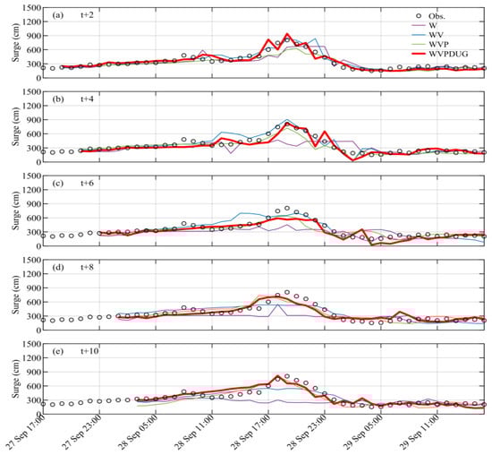 Forecast results for long-lead-time typhoon waves during the Dujuan event (validation) with different parameter combinations: (a) t + 2; (b) t + 4; (c) t + 6; (d) t + 8; (e) t + 10.
