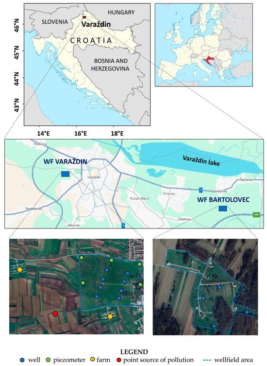 The study area is located in the north of the Republic of Croatia and includes the area of the Varaždin and Bartolovec wellfields, which are located near the town of Varaždin (Figure 1). The Varaždin region is one of the most densely populated and economically developed areas in Croatia. The quality of the groundwater in the wellfields is generally consistent and within the prescribed limits, except in terms of nitrate concentration. Namely, the average values at the Varaždin wellfield are above the maximum allowable concentration (MAC) according to the national limits of 50 mg/L NO3−, while at the Bartolovec wellfield is below MAC. As previous studies have shown, the reason for the high nitrate concentration in the Varaždin wellfield is agricultural land and point sources of pollution located in the immediate vicinity of the wellfield (Figure 1) [55]. Due to high level of nitrates, the Varaždin wellfield was put out of operation in 2004. In order to meet the quantitative demand for drinking water and at the same to time reduce the nitrate concentration in the regional water supply system, the pumping rates were reduced at the Varaždin wellfield, and increased at other wellfields in the area [56].