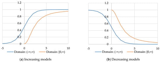 When analyzing groundwater quality, sigmoidal models are often used, which are defined on the basis of Logistic, Gompertz or Richards functions. These are sigmoidal functions that describe growth as slowest at the beginning and end of a given period. These functions are used in a number of areas, e.g., biology, chemistry, demography, economics, geoscience, probability, statistics and others. The domain of these functions is the entire number line, and they were used to define time series that mathematically describe changes in groundwater quality over time [50,52,53]. As mentioned in the introduction, the shortcoming of this functions is that their domain is the whole number line (−∞, +∞). Since the pumping rate cannot be negative (except when pumping water into the system which is not the subject of this research), nor can the distance from the source of pollution, and the mathematical descriptions of the influence of nitrate concentration on these factors in this paper are defined on the basis of the following functions: Michaelis–Menten, Hill 1 and 2 and Rosin–Rammler 1 and 2. The domain of these functions is only the positive part of the number line [0, +∞). The functions are also used in many fields, such as biochemistry, pharmacology or even particle size distribution analysis [60,61,62]. The models are modified depending on whether they are monotonically increasing or decreasing. Thus, monotonically increasing models were used for the dependence of the nitrate concentration on the pumping rate (Figure 3a), while monotonically decreasing models were used for the dependence of the nitrate concentration on the distance from the pollution source (Figure 3b). The figure shows the theoretical models, and as can be seen, their fit to the experimental data is different due to the different domain. So, domain-restricted models (Michaelis–Menten, Hill and Rosin–Rammler) were selected to address physical realities: pumping rates and distances cannot be negative, while traditional models (Logistic, Gompertz or Richards) were retained for comparison purposes.