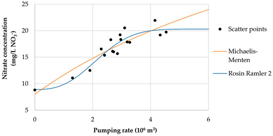 The pumping rate at the Bartolovec wellfield changed over time, which caused a change in the nitrate concentration in the groundwater, but it did not exceed the MAC. The dependence of annual average nitrate concentration on pumping rate is shown in the scatter diagram (Figure 4). As examples, the worst (Michaelis–Menten) and best (Rosin–Rammler 1) fitted functions are given here. From the point distribution, it is evident that nitrate concentrations in groundwater increase with the increasing pumping rates.