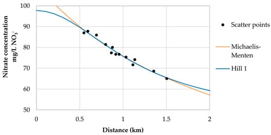 At the Varaždin wellfield, the nitrate concentration was above the MAC (50 mg/L NO3−) at all groundwater sampling locations (the reason of putting the station out of operation). The dependence of nitrate concentration on the distance from the point source of pollution is shown in the scatter diagram (Figure 5). From the point distribution, it is evident that nitrate concentration in groundwater decreases with distance of the pollution source. As examples, the worst (Michaelis–Menten) and best (Hill 2) fitted functions are given here.