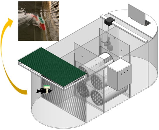 The ECGs of the carp were measured using a custom-built platform for evaluating energy and material flow during fish passage, developed by the Environmental and Ecological Research Institute at Shandong Normal University. The water tank dimensions are 321 cm × 119 cm × 127 cm (L × W × H) (Figure 1). The apparatus mainly consists of a frequency converter, electric motor, and propeller. Temperature control within the tank was achieved using a heating rod and chiller, maintaining stable water temperatures throughout the experiment (fluctuations within 1 °C), monitored by a high-precision thermometer. The motor speed was regulated by the frequency converter, which in turn controlled the propeller to generate a steady water flow. This device includes three parts: ECG, metabolism and behavior. This study mainly evaluated the cardiac function of fish through the ECG part of the device.