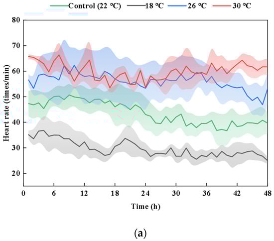 In terms of aquaculture, it is recommended that the temperature should be strictly controlled within 22 °C–24 °C during aquaculture to prevent negative effects on the cardiac function of fish. At the same time, it is recommended to take temperature control measures in an environment with large temperature changes to avoid sudden temperature rises and drops (temperature changes do not exceed 2 °C/h). In addition, based on the high sensitivity of the heart rate to temperature changes, we suggest using ECG monitoring technology to track the effects of water temperature changes on cardiac function in real time and to adjust the temperature immediately when the heart rate is abnormal to reduce the physiological stress response of fish.