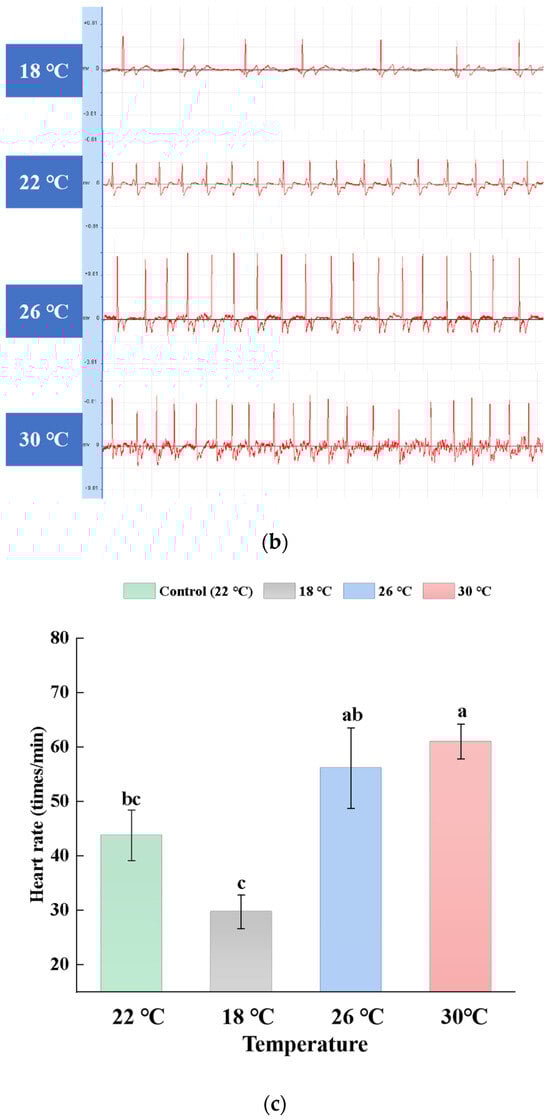 Comparison of the carp heart rate at different temperatures. (a) Heart rate of carp at different temperatures for 48 h. (b) Representative recordings of the raw ECG data at different temperatures. (c) Significant difference between the heart rate at different temperatures. Results are means ± SD. The different lowercase letters indicate significant differences among samples (p < 0.05).