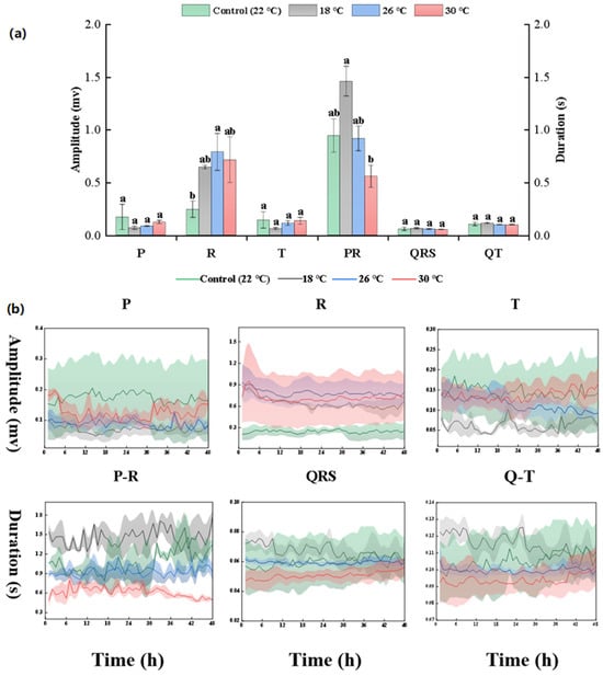 Comparison of the carp heart ECG at different temperatures. (a) Amplitude and duration of the carp heart ECG indexes for 48 h. (b) Real-time heart ECG signal strength of carp. The units of amplitude (P, R, and T wave) and duration (P-R interval, QRS complex, and Q-T interval) are mv and s, respectively. Results are means ± SD. The different lowercase letters indicate significant differences among samples (p < 0.05).