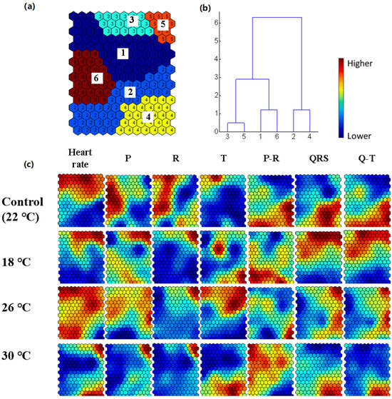 Figure 4 shows the SOM analysis results based on the seven ECG indexes of Cyprinus carpio under different temperature conditions, and the data are divided into six clusters. The vertical column color indicates the intensity, where red represents high intensity and blue represents low intensity, and the color from red to blue indicates the change of intensity from high to low. Clusters within the same period demonstrate greater closeness, reflecting the rhythmic phenomena of carp from the perspective of the clustering analysis. Clusters 3 and 5 correspond to the photoperiod range, which is consistent with the red high-intensity area, indicating that the intensity of the cardiac activity is high during the photoperiod. Clusters 2 and 4 correspond to the dark period range, which is consistent with the blue low-intensity area, indicating that the intensity of the cardiac activity is low during the dark period. The data of clusters 1 and 6 are more distributed, mainly located in the transition phase of the light–dark cycle.