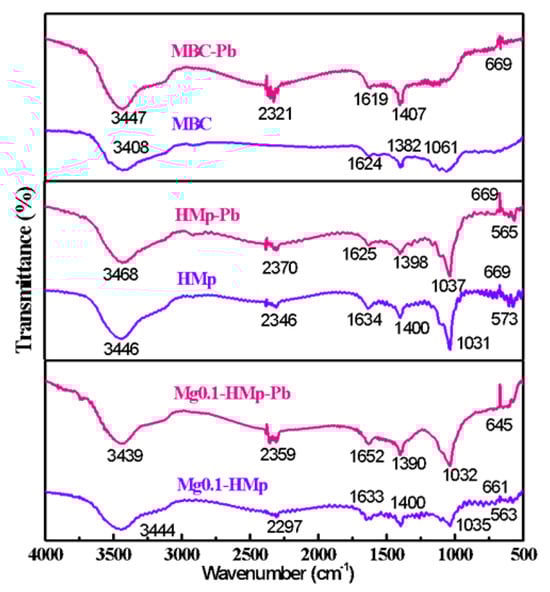 3.2.4. Possible Mechanisms Pb(II) Adsorption onto HMp and Mg0.1-HMp