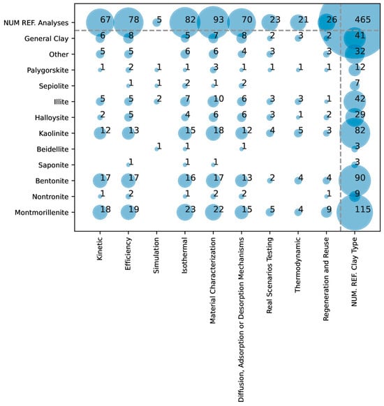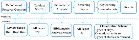 The predefined set of keywords served as the basis for conducting the mapping and analysis processes in the study [,,]. However, during the screening process, and together with the keywords associated with the types of clays, operational units set, and types of studies performed, different keywords were also considered for inclusion for analysis.