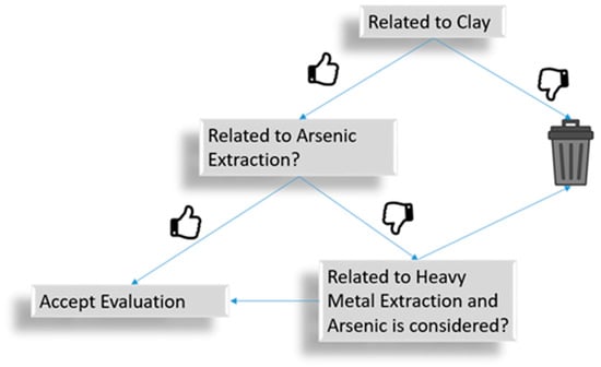 A systematic analysis was conducted on the collected dataset with a primary focus on assessing the relevance of the titles to the key facets identified previously. In cases where uncertainty arose, a more detailed analysis was performed based on the information provided in the abstracts. This evaluation process followed a structured pipeline approach, as illustrated in Figure 2. The main objective of this rigorous screening was to ensure that each manuscript included at least topics connected to clay and arsenic removal (absorption, desorption, precipitation, and others, as defined by the keyword approach) from fluids. Manuscripts that were not directly connected to clay’s absorption of heavy metals were further analyzed to check whether arsenic was considered in them.