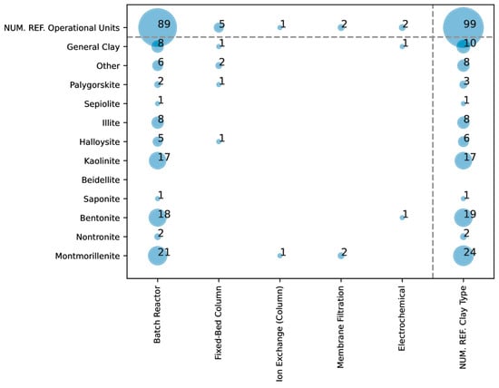 Figure 3 shows the different types of clays used in function of the different operational units used during the adsorption of arsenic. Montmorillonite, for example, is referenced 21 times, making it one of the most widely used clays, followed by bentonite, with 18 references, and nontronite, with 2. Kaolinite appears with a frequency of 17 references, suggesting its comparative effectiveness or availability in experimental studies. Other clays, like illite and sepiolite, are less frequently used, with six and eight references, respectively, indicating limited or niche applicability.