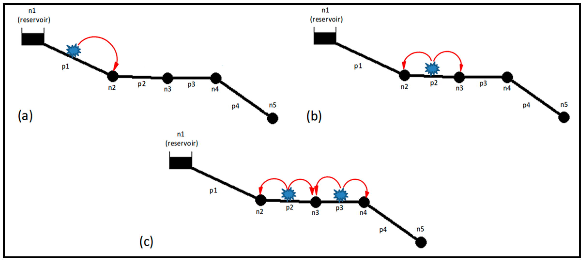 To enumerate various leakage configurations that may take place in a WDN and to explain how they are dealt with in the proposed algorithm, a simple pipeline network composed of 4 pipes and 5 nodes fed by a reservoir (node n1) is considered, as shown in Figure 1.