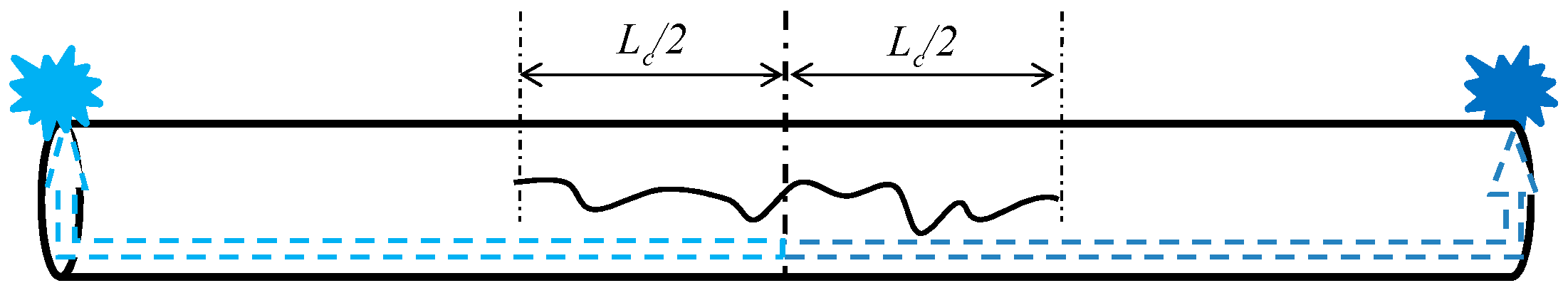 Without loss of generality, a simple representation of a centred crack of a longitudinal shape is shown in Figure 2, in which, geometrically, the crack length contributes equally to the leak outflow from both sides of the pipe.