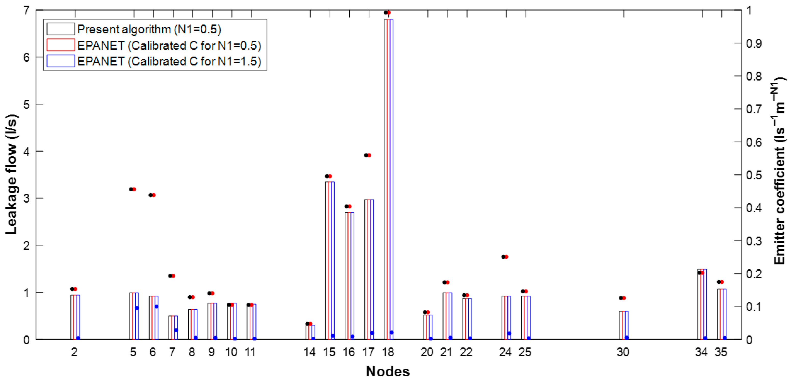 Table 6. Calibrated values of the emitter coefficients in the leaking nodes under EPANET 2.2. (values leading to the same pressures and leakage flows as in Table 5).
