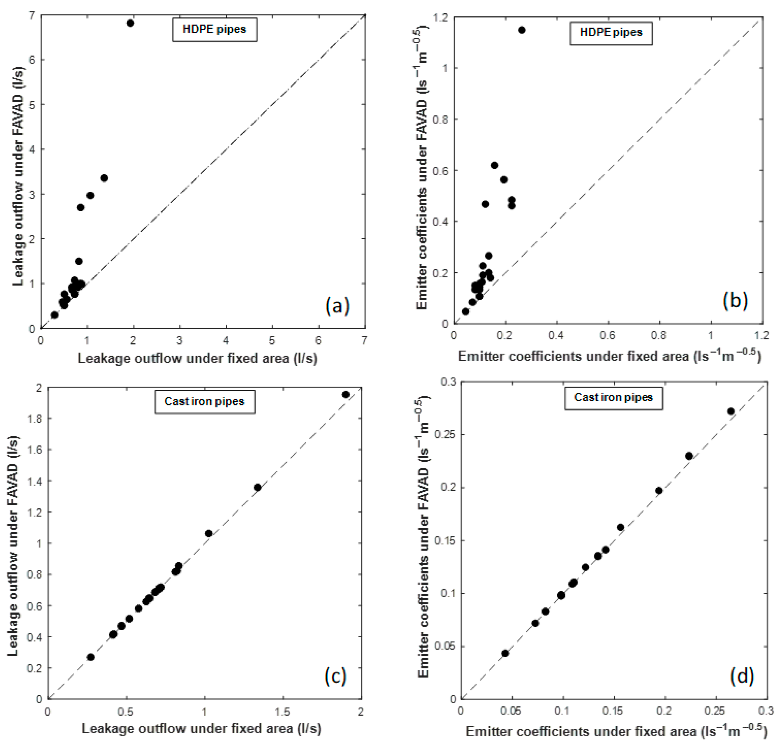 Table 9. Comparison of results for fixed-area and FAVAD approaches for HDPE and cast iron pipes.
