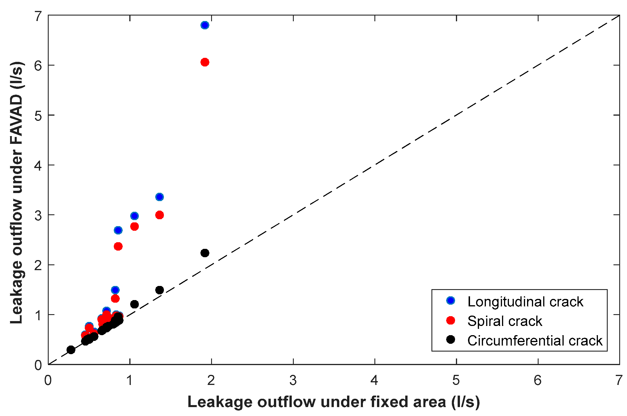 The slope m was found to be a function of the pipe material and dimensions (Young modulus, diameter and wall thickness), the leaking crack length, and the flow characteristics. Cassa and van Zyl [36] performed an intensive series of numerical tests to build up empirical formulae for the parameters m depending on the leak shape (longitudinal, spiral and circumferential cracks):