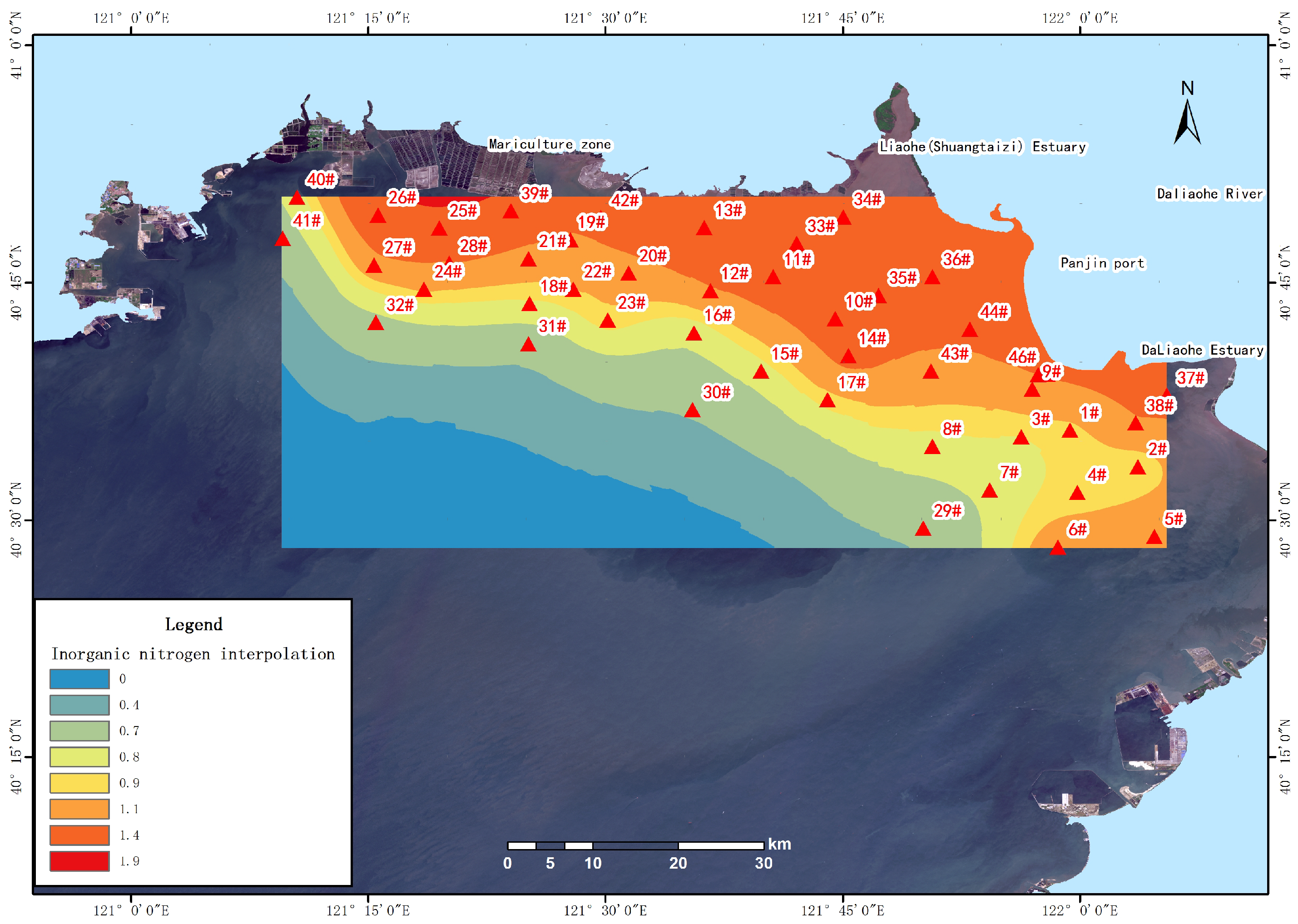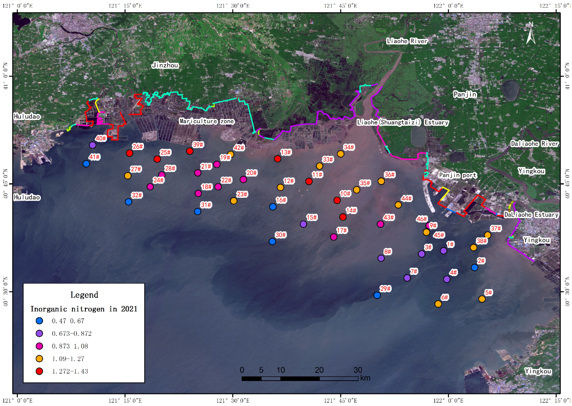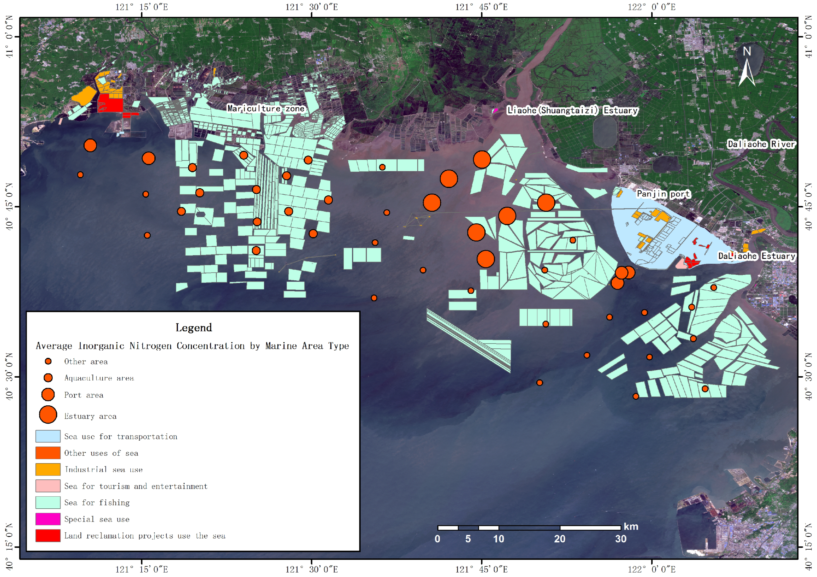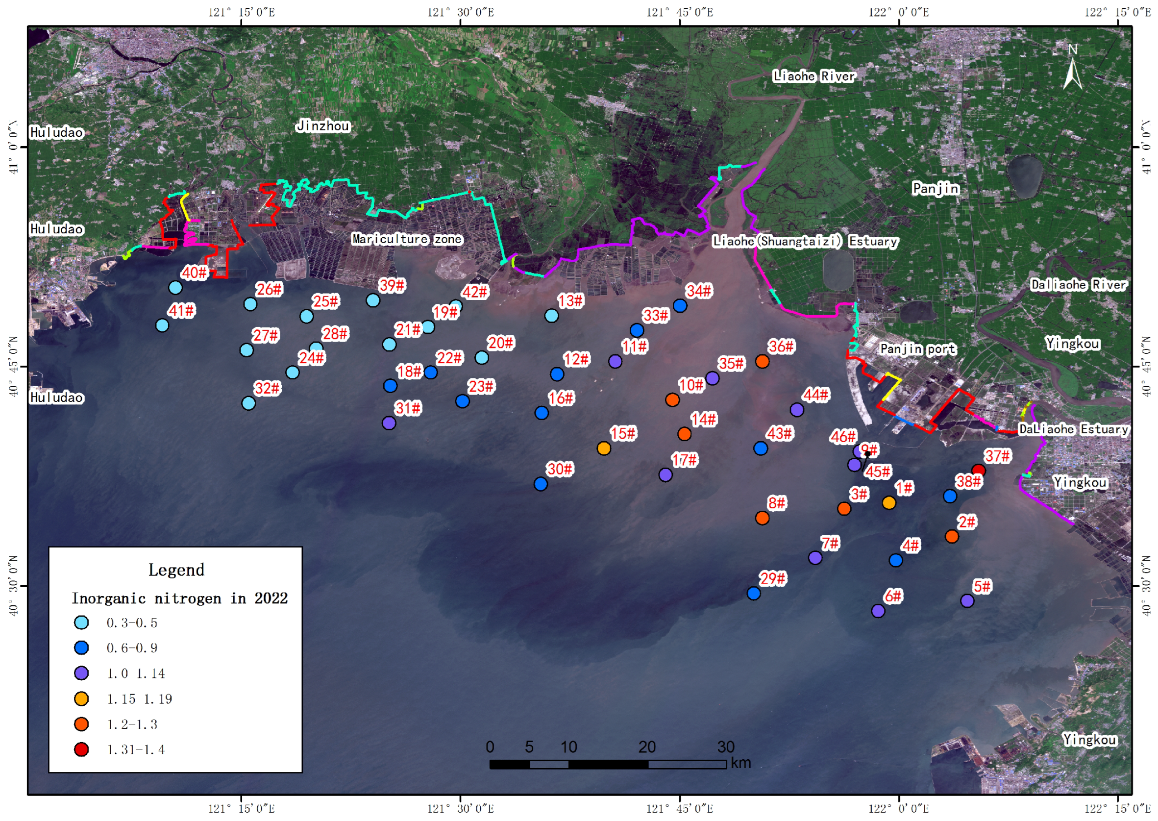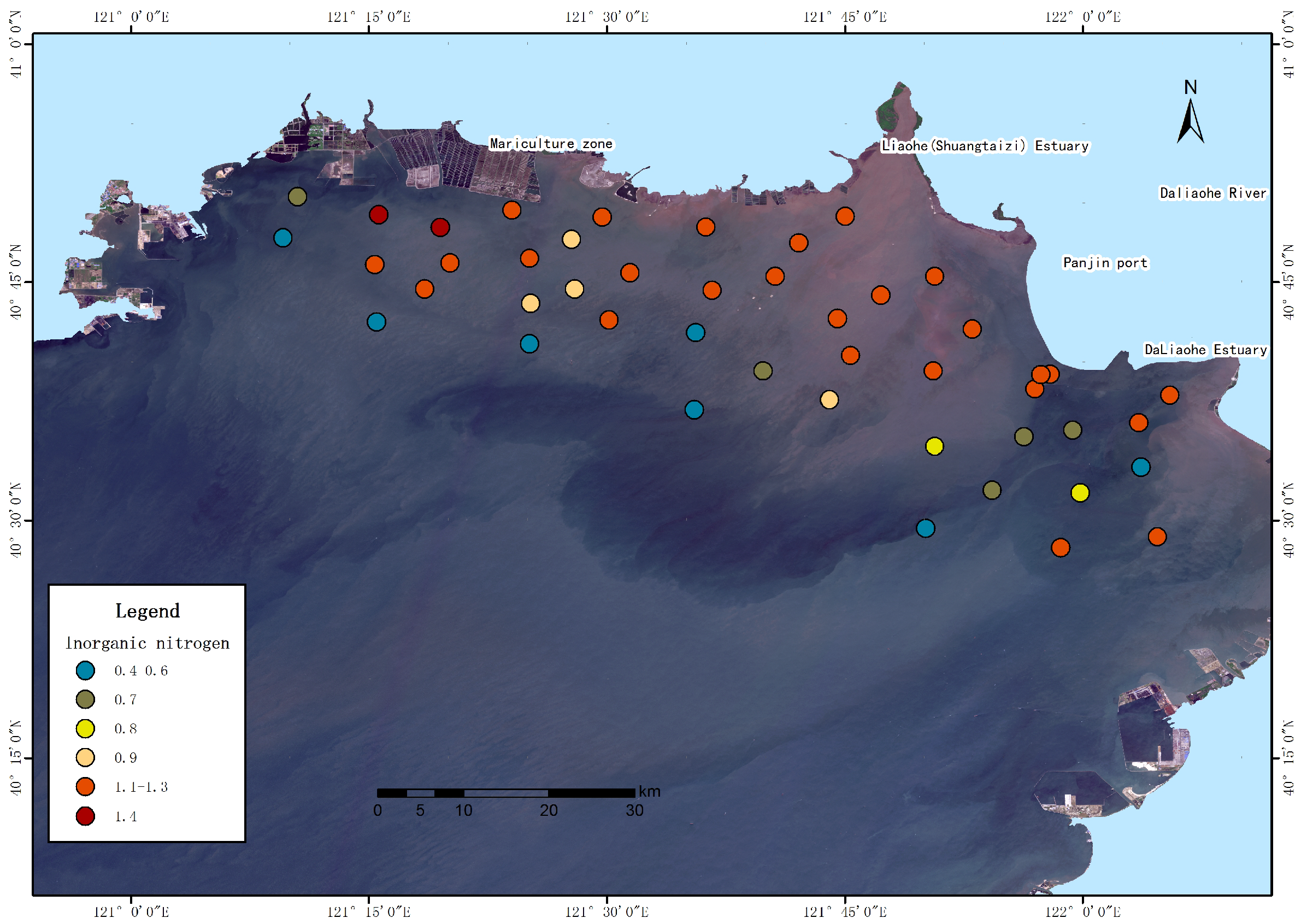 - The water quality in the coastal waters of Liaodong Bay is generally good, but the content of inorganic nitrogen generally exceeds the level specified in the standard. This is mainly related to urban industrial emissions in the Liaohe River Basin.