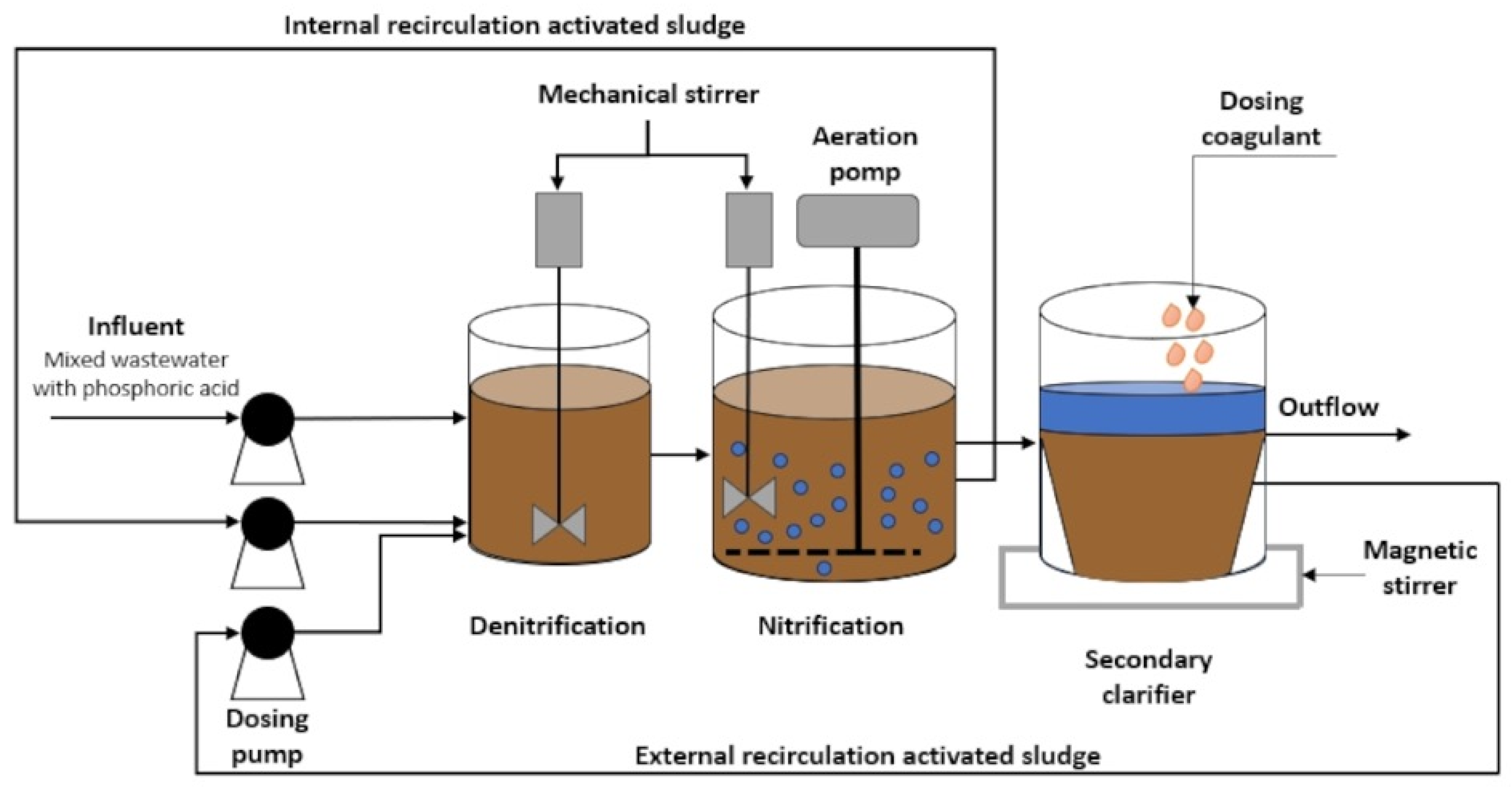 - Secondary clarifier with a working volume of 20.0 L. A coagulant, in the form of a 35% (v/v) ferric chloride (III) solution, was added to the sludge-containing wastewater to enhance sludge sedimentation. The tank was equipped with a magnetic stirrer operating at 120 rpm.