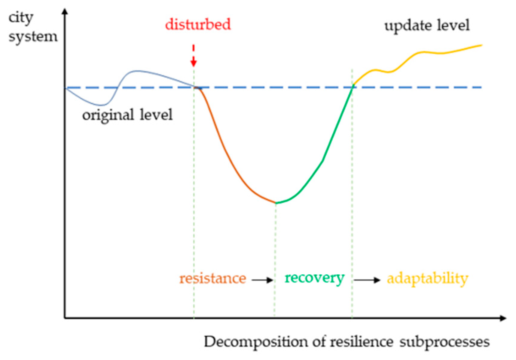 Figure 2, the city system represents the urban system’s structure and function under external disturbances. Disturbed refers to the impact of flood disasters, causing deviation from the original state. The original level is the normal operating state of the city without external disturbances, reflecting stability. The update level indicates the development achieved after resistance, recovery, and adaptability [