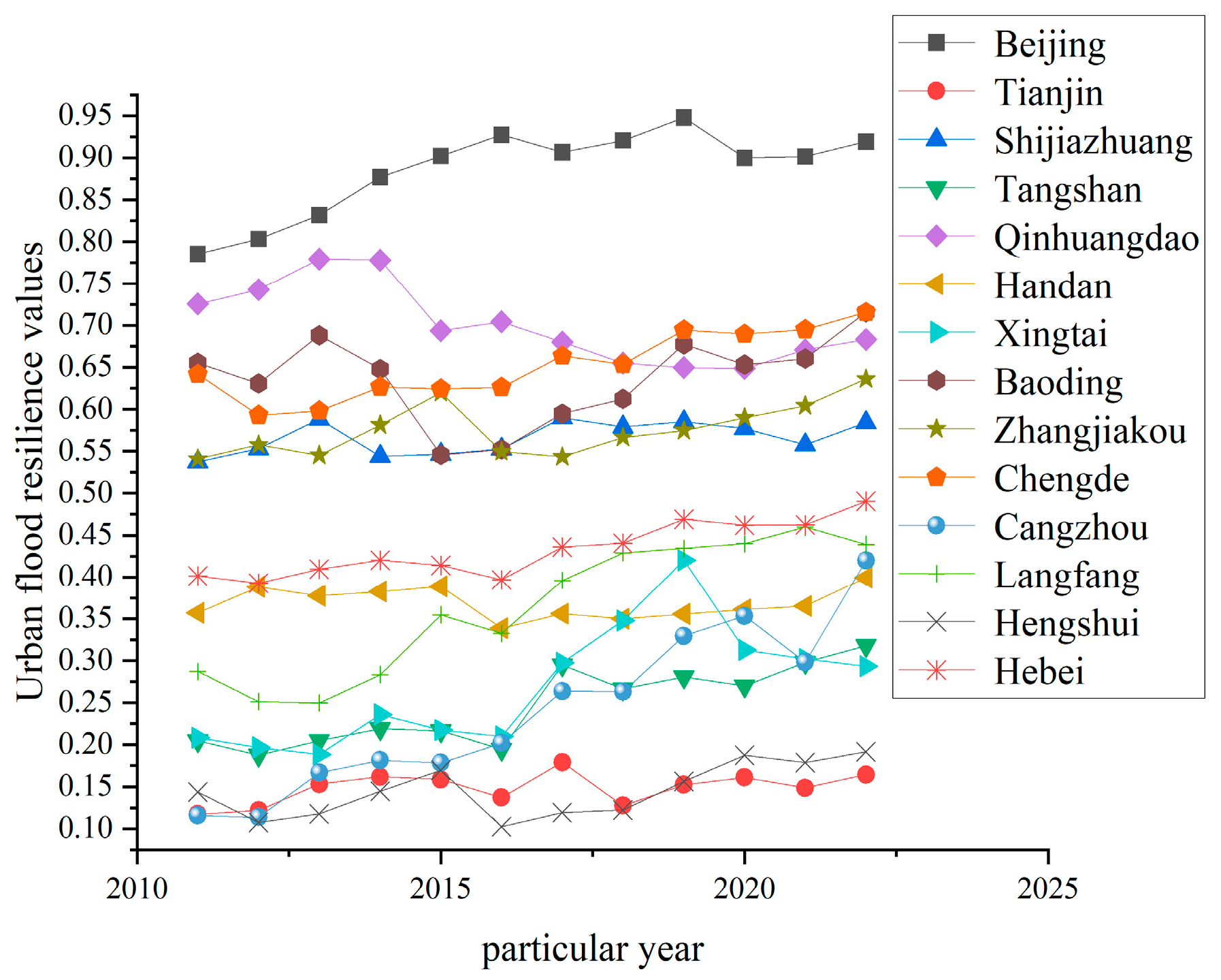 Therefore, this study constructs an indicators system of UFR from the process perspective of resistance, recovery, and adaptability, which considers the perspectives of nature, economy, society, and infrastructure. Index weights are determined using the CRITIC method, which integrates entropy weighting. UFR levels of 13 cities in the BTH region from 2011 to 2022 are evaluated using the VIKOR method [