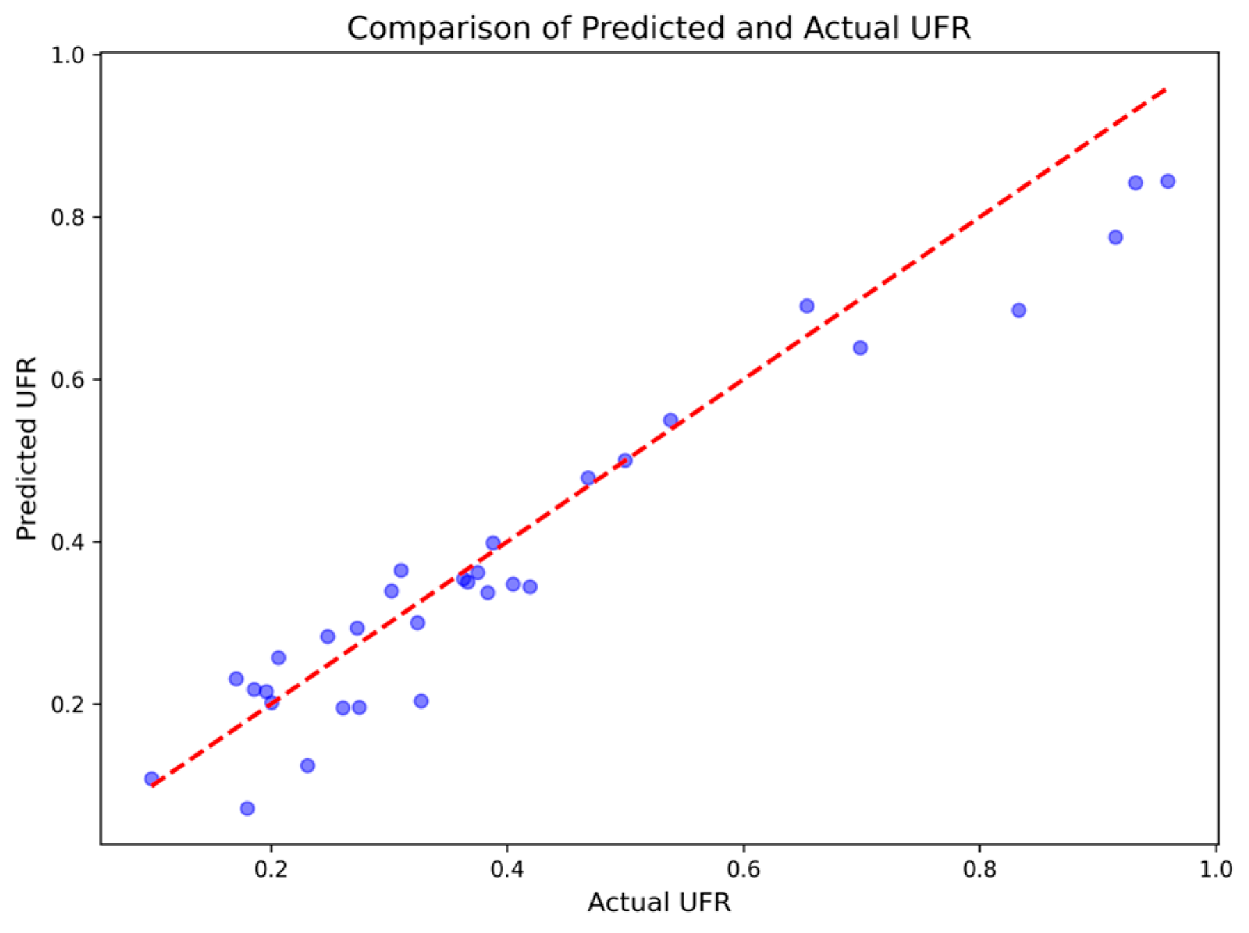 Figure 6 shows a comparison between the model’s predicted UFR values and the actual values. The blue points represent the predicted and actual values for each city, while the red dashed line represents the ideal perfect prediction line. Most of the points are close to the diagonal, indicating that the model’s predictions are generally accurate, though a few points deviate from the line, suggesting prediction errors in certain cities or years. Overall, the model can accurately predict UFR values in most cases.