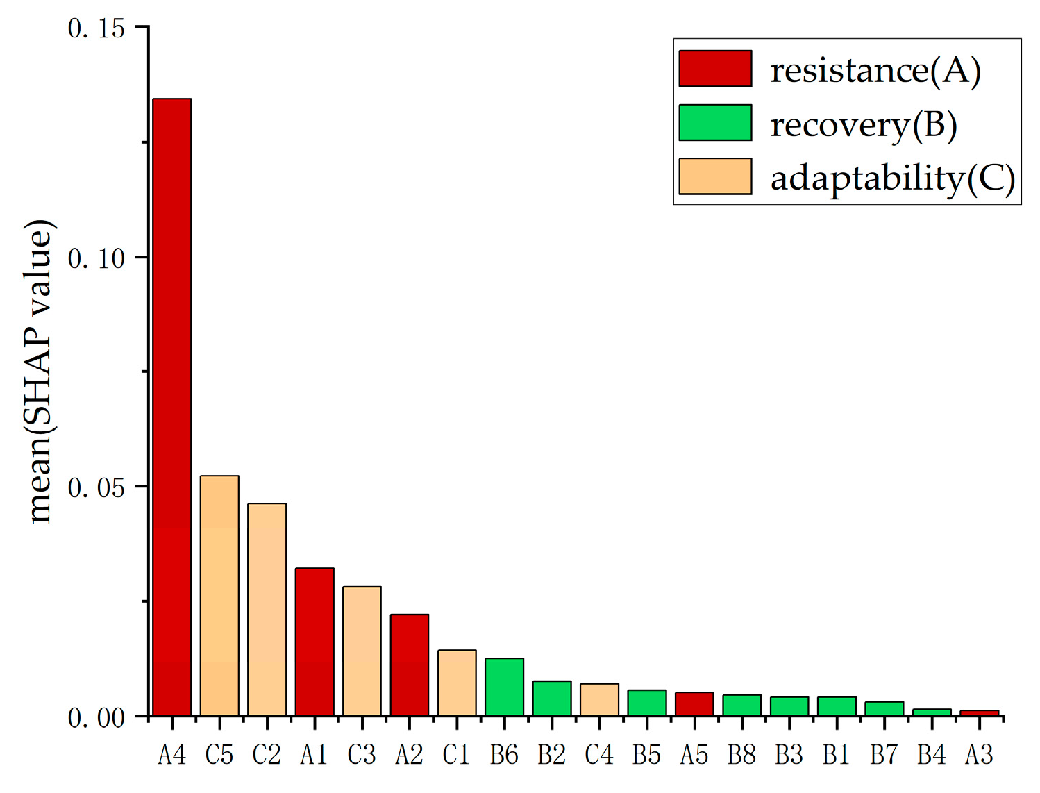 Figure 7. From a policy perspective, resources should be allocated toward the key positive indicators, particularly those with a higher SHAP value, such as urban slope and green coverage. Furthermore, targeted management strategies should focus on constraint indicators, such as the unemployment rate, to improve overall resilience.