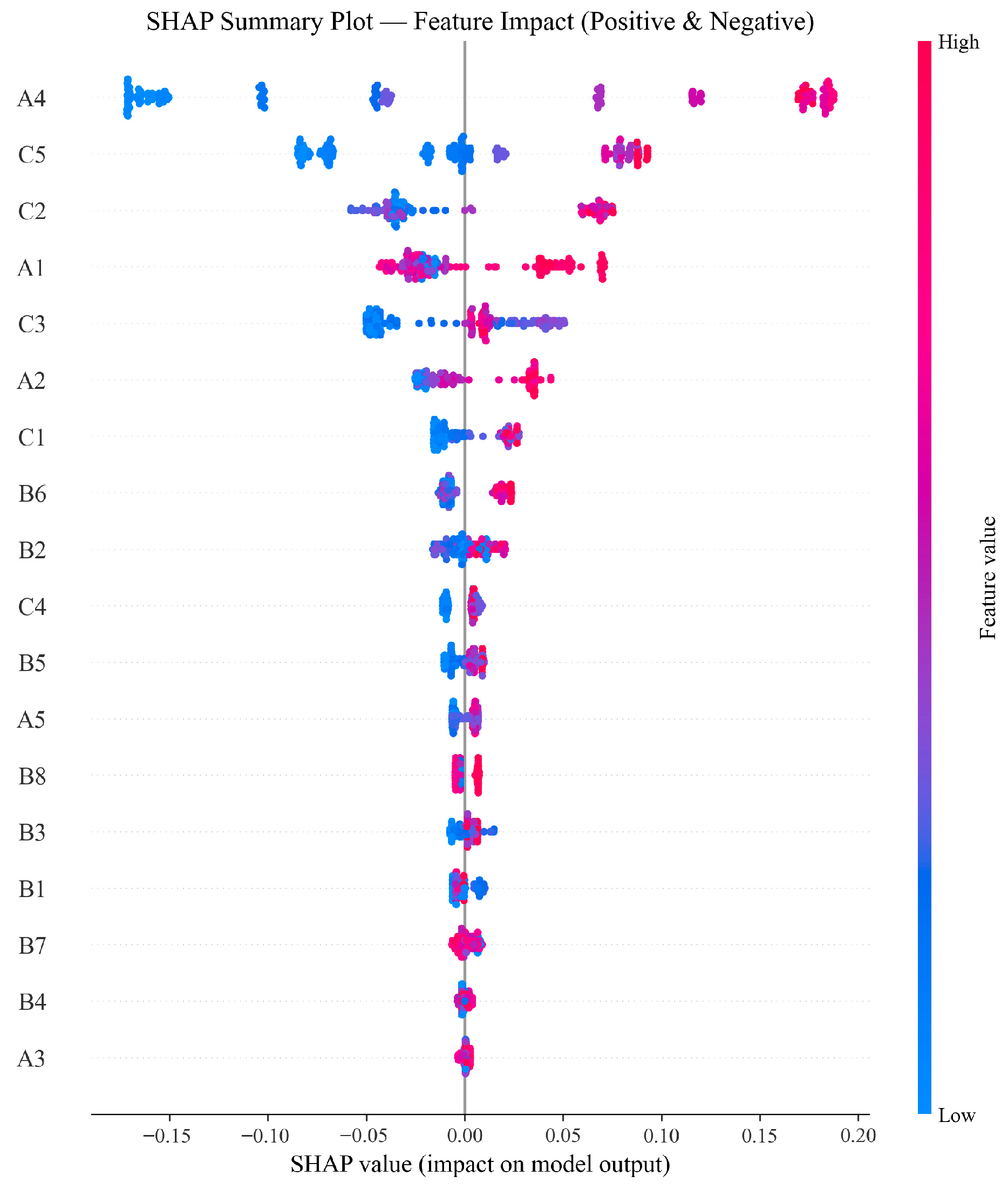Figure 8 shows the positive and negative impacts of each feature on the prediction results at different value levels. The horizontal axis represents the SHAP values, with each point representing a sample; the color gradient from blue to red indicates the feature values ranging from low to high.