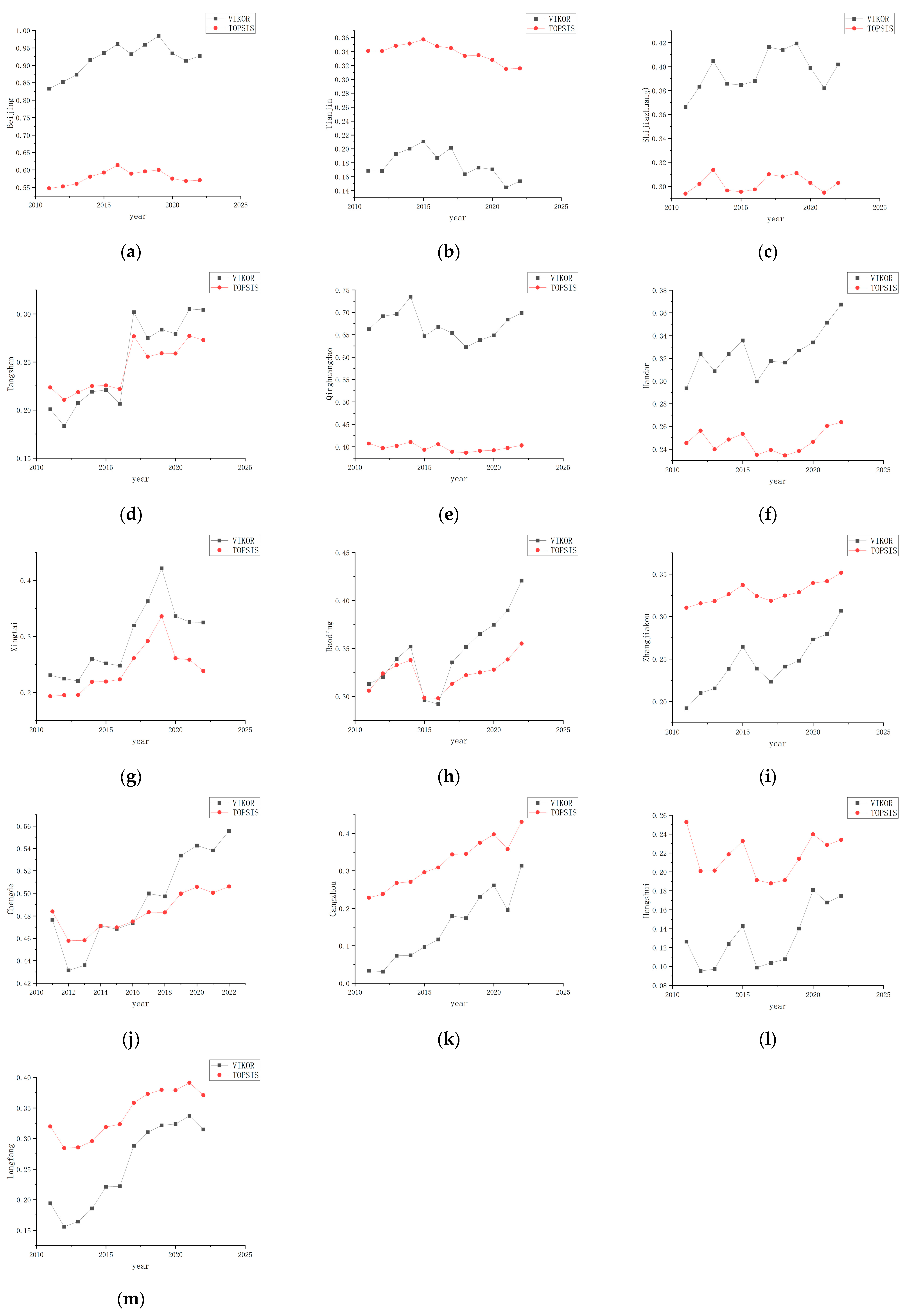 Figure 9, it is evident that the VIKOR curve shows a wider interval, stronger inter-annual monotonicity, and no intersections between cities, significantly outperforming the low distinguishability of TOPSIS. VIKOR demonstrates higher sensitivity and is better at capturing the fluctuating changes in UFR.