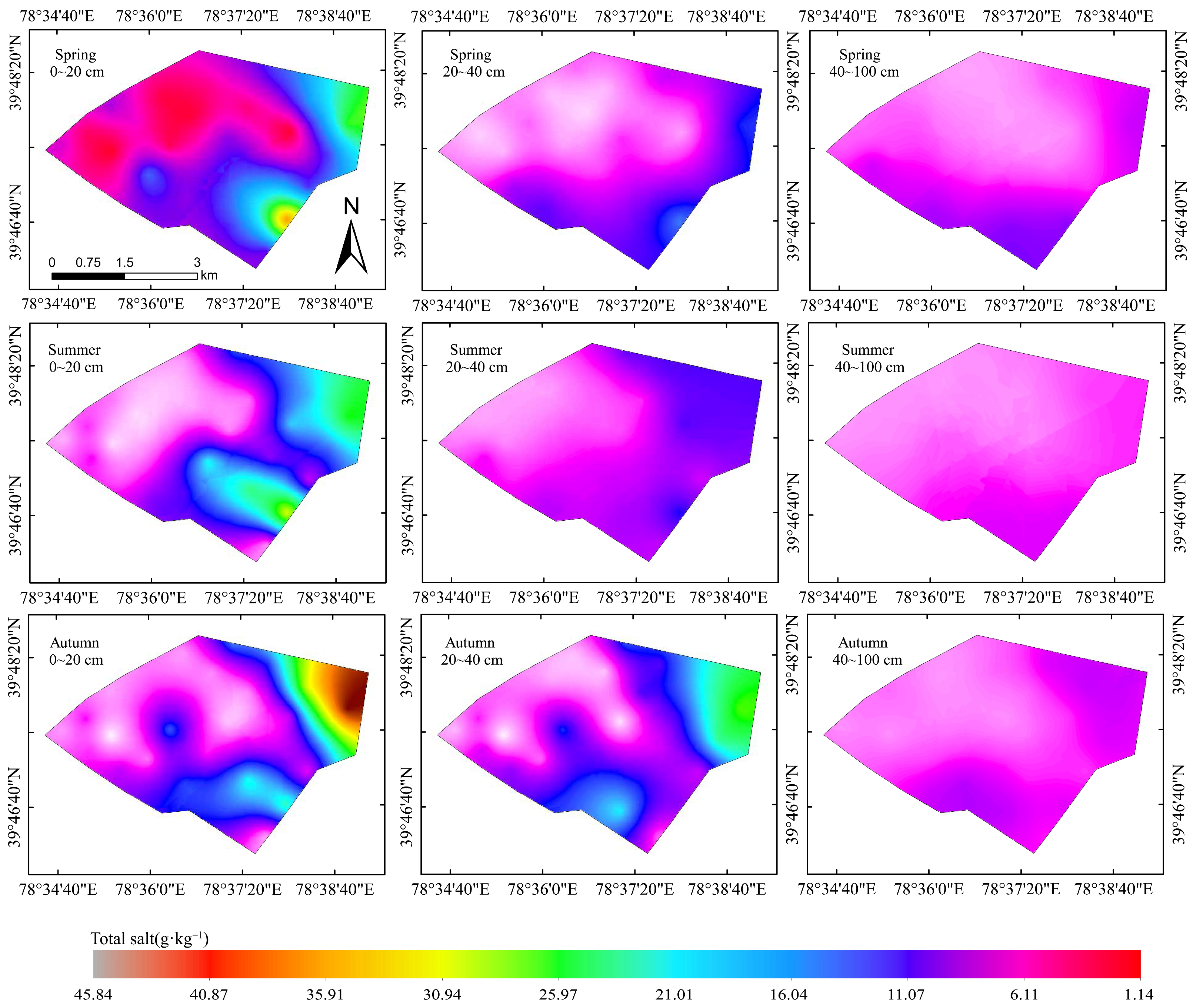 3.3. Spatiotemporal Distribution Characteristics of Soil Salinity