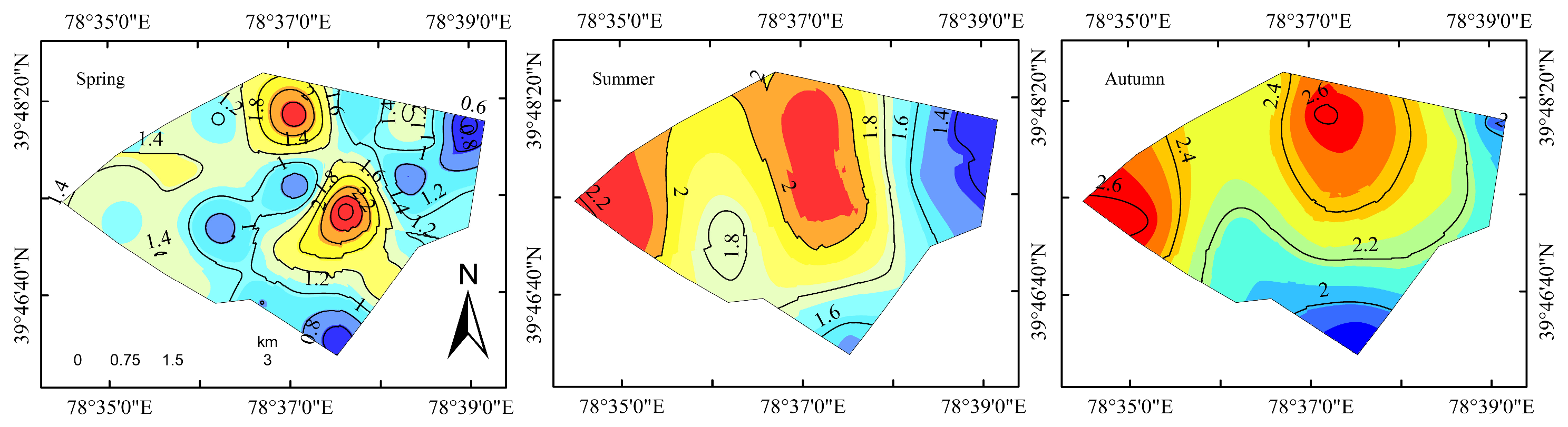 | Season | Soil Depth (cm) | Maximum (g·kg−1) | Minimum (g·kg−1) | Average (g·kg−1) | Standard Deviation | Coefficient of Variation % |
