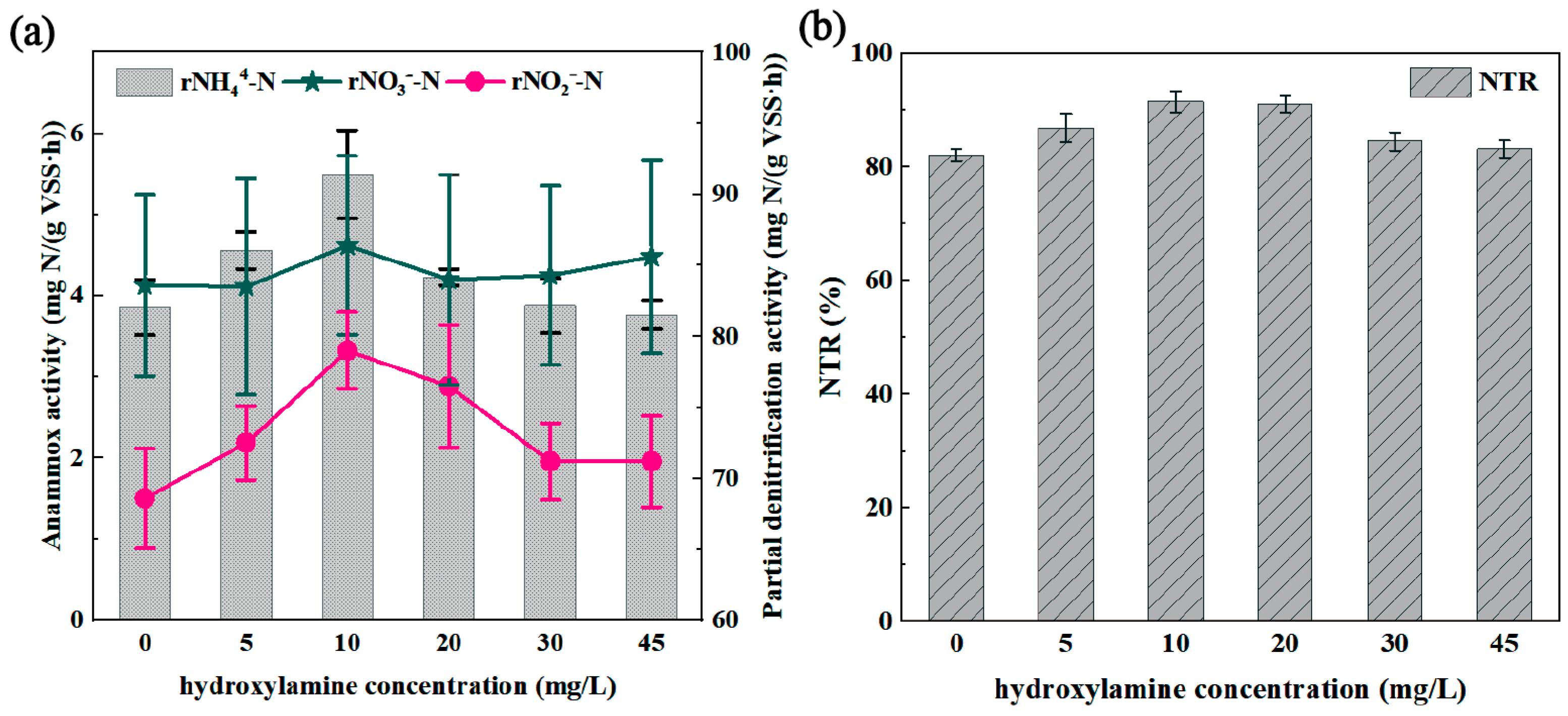 - Zhang, Q.; Lin, L.; Chen, Y.; Wang, Y.; Li, X.; Li, L.; Cao, W.; Zhang, Y. Dual-Edged Effects and Mechanisms of Hydroxylamine in Partial Denitrification-Anaerobic Ammonium Oxidation System. Environ. Res. 2023, 235, 116664. [Google Scholar] [CrossRef]