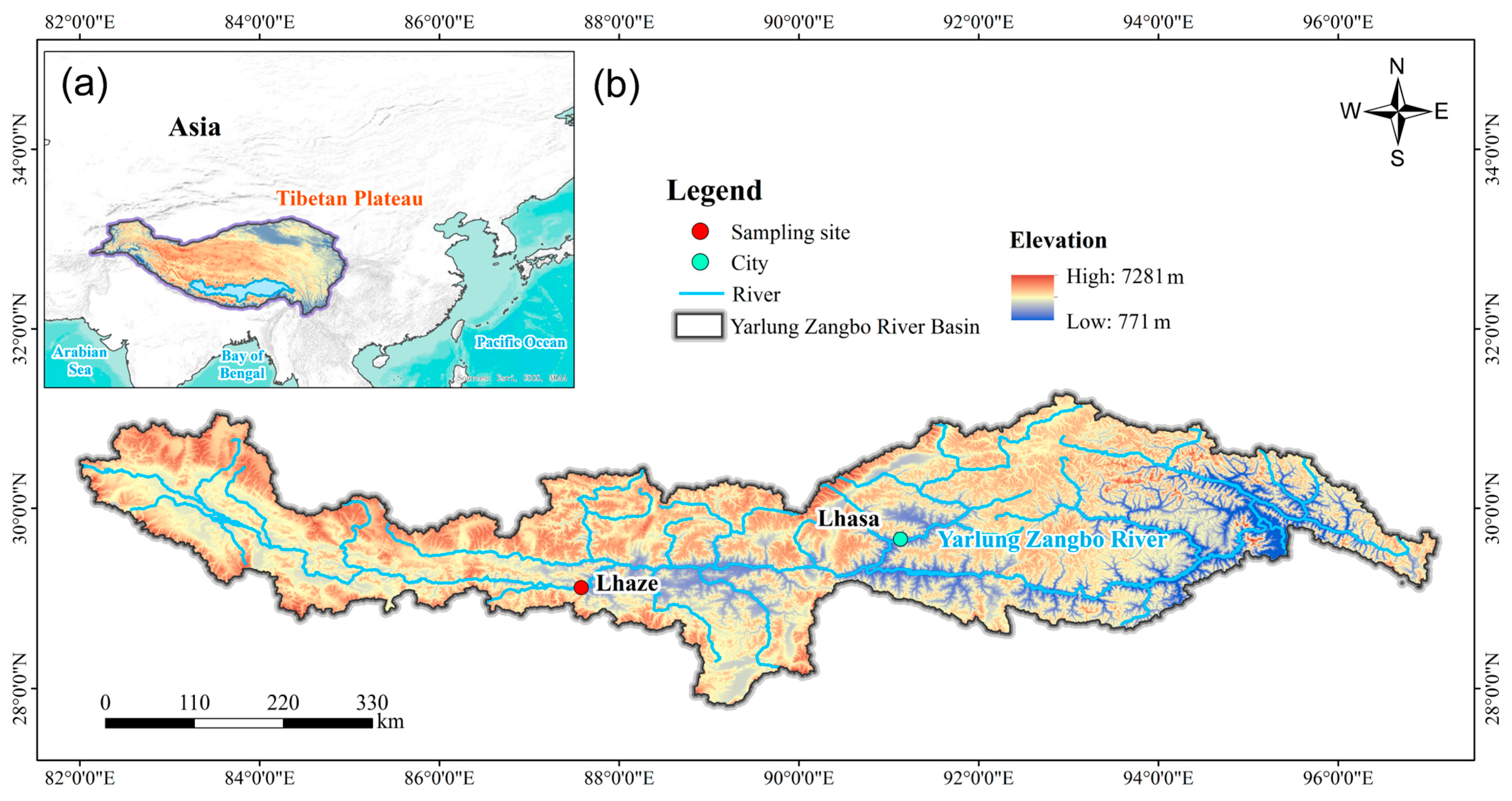 - Qu, B.; Zhang, Y.; Kang, S.; Sillanpää, M. Water chemistry of the southern Tibetan Plateau: An assessment of the Yarlung Tsangpo river basin. Environ. Earth Sci. 2017, 76, 74. [Google Scholar] [CrossRef]