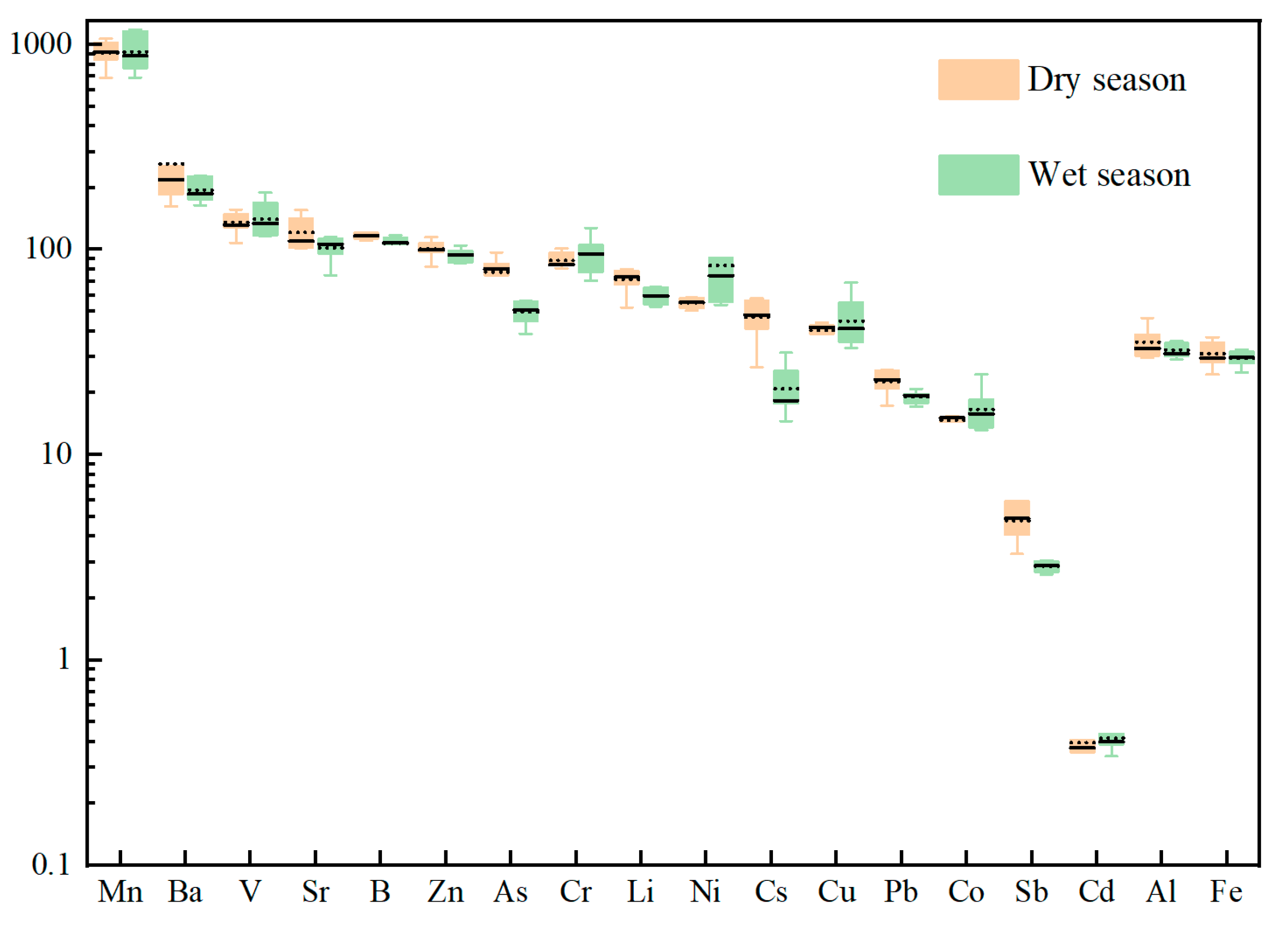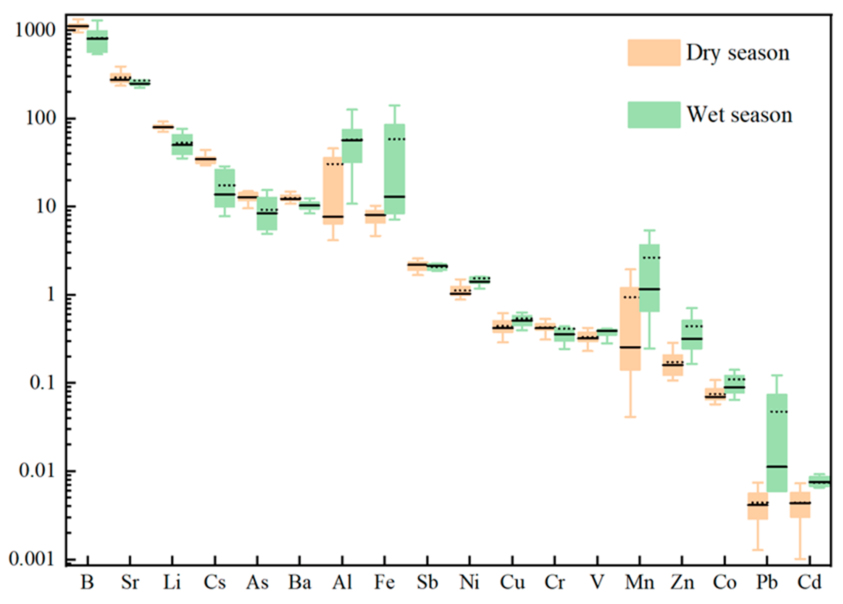 4.2. Seasonal Variations in the Concentrations of River Water and SPM Trace Elements in the YTR