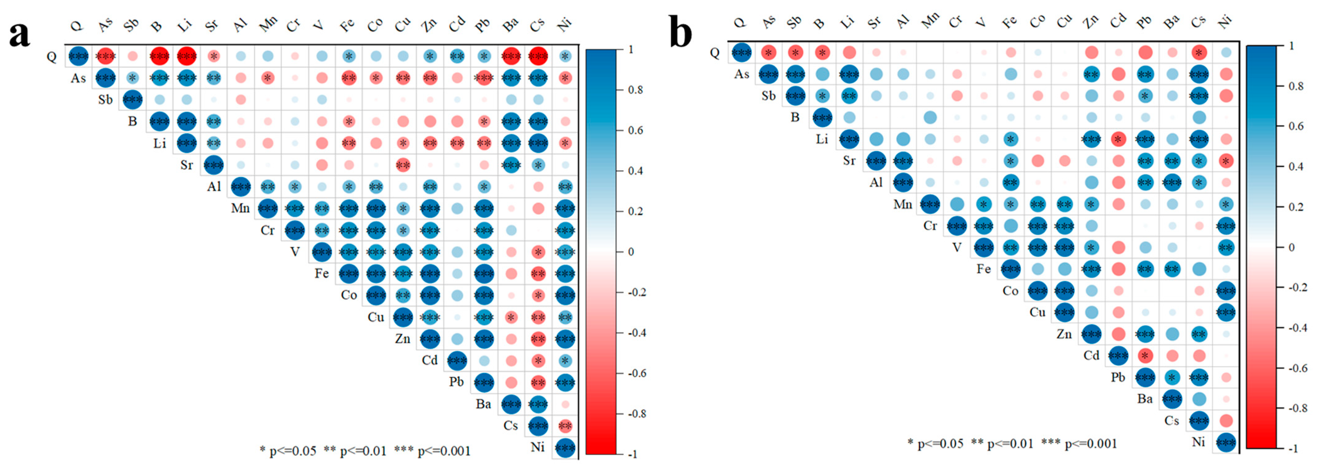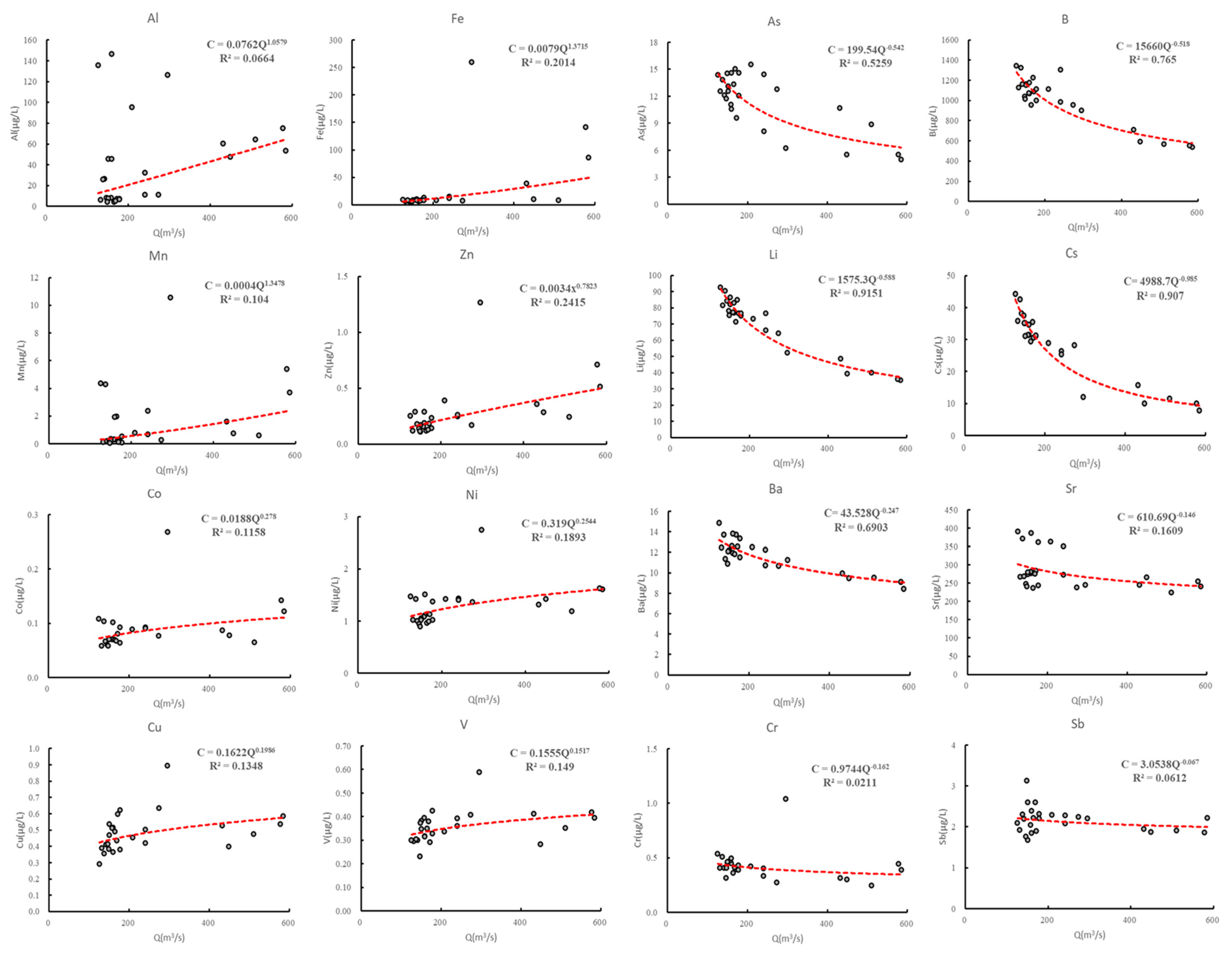 4.4.1. The Variation Characteristics of YTR Water and SPM Trace Elements with Discharge
