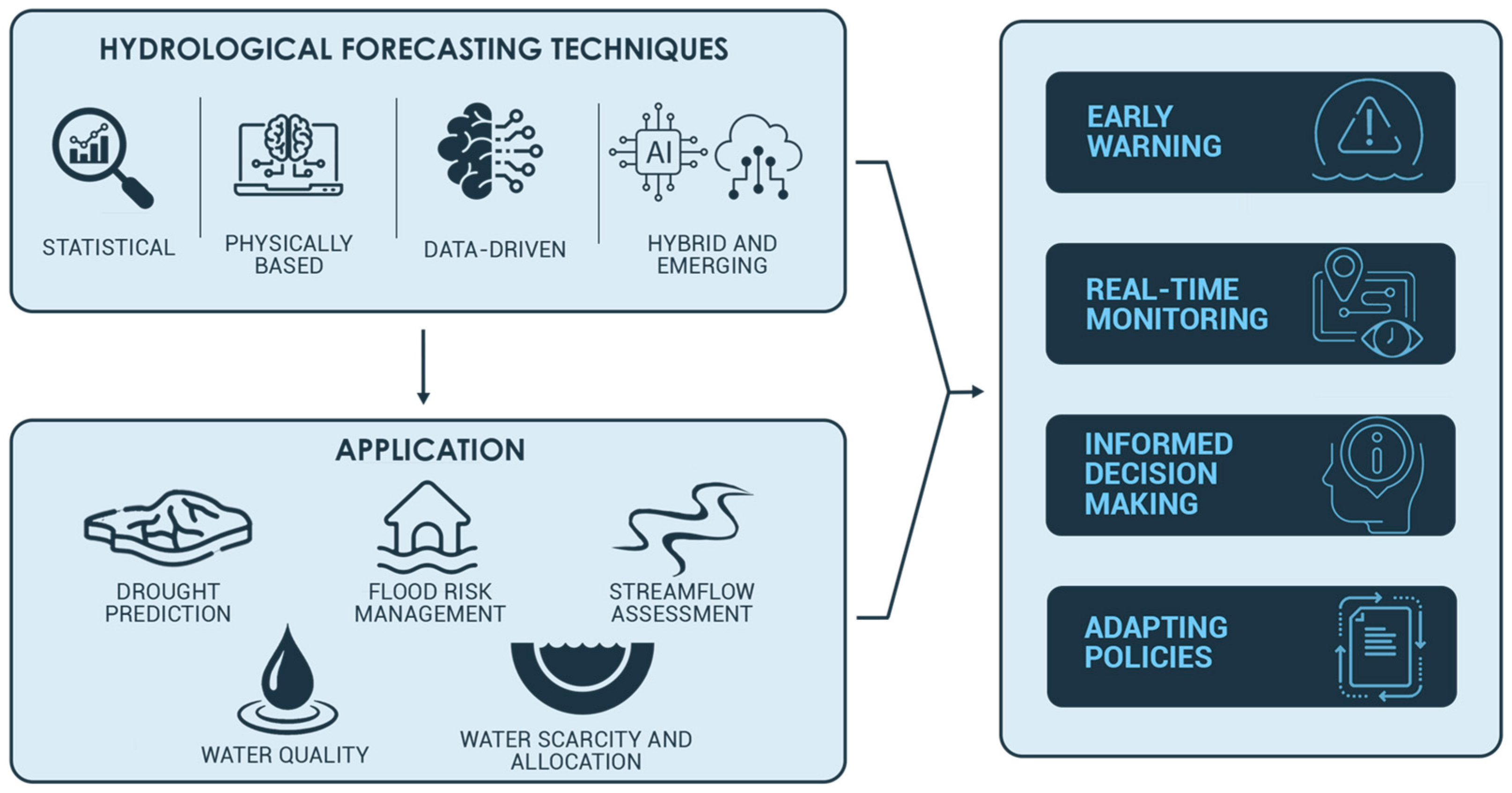 - Foundational models remain essential: Traditional statistical and physically based models provide critical insights into hydrological processes, but their standalone capabilities are limited in representing complex nonlinear interactions and rapidly changing climate-driven dynamics.