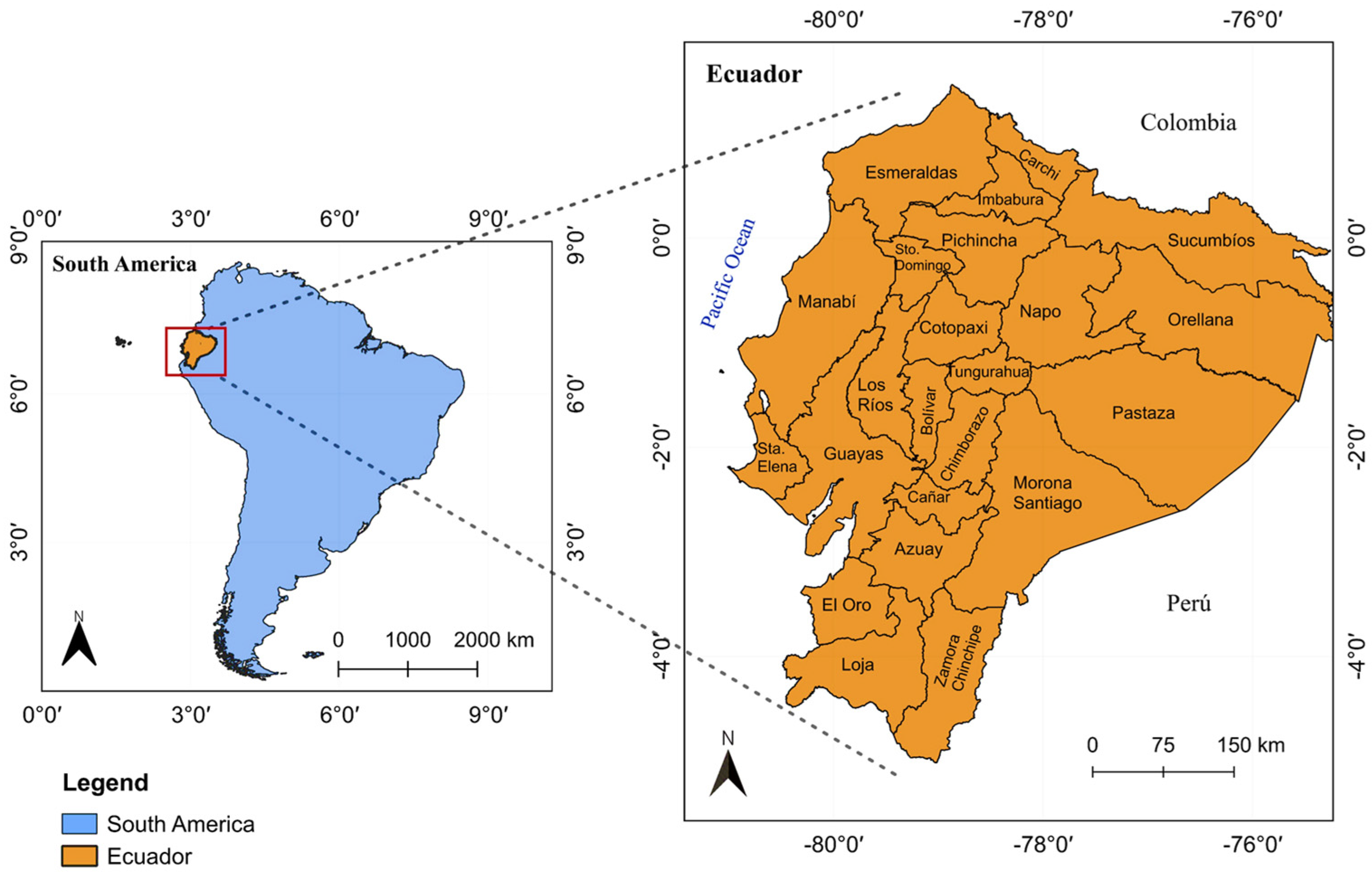 - Wikipedia. Ecuador. Wikipedia Fundation. 2025. Available online: https://es.wikipedia.org/wiki/Ecuador (accessed on 21 August 2025).