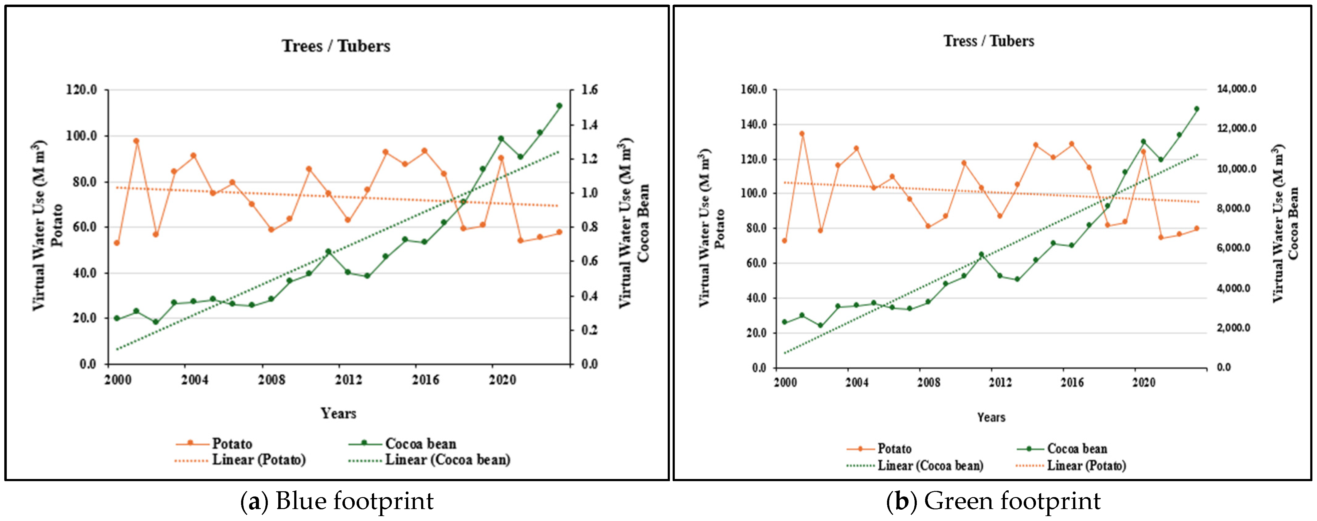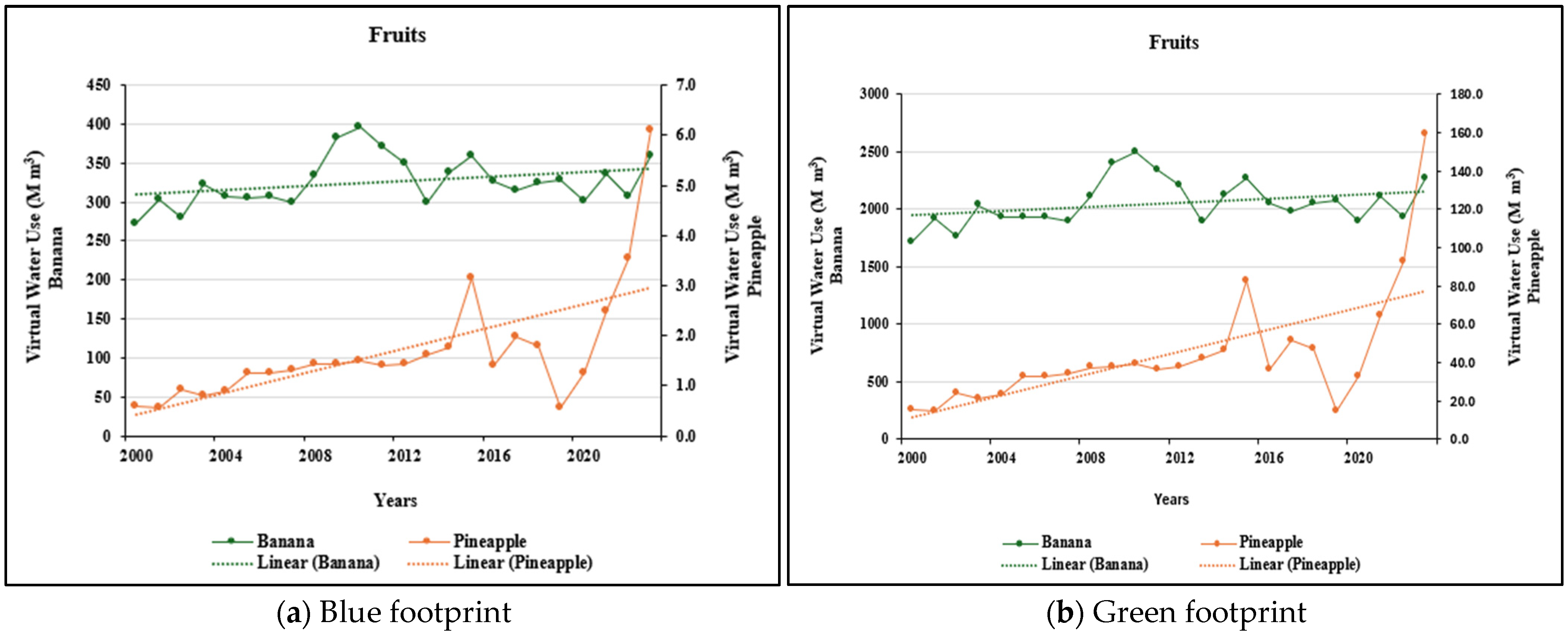 3.1. The Virtual Water Use in Ecuador’s Crop Production