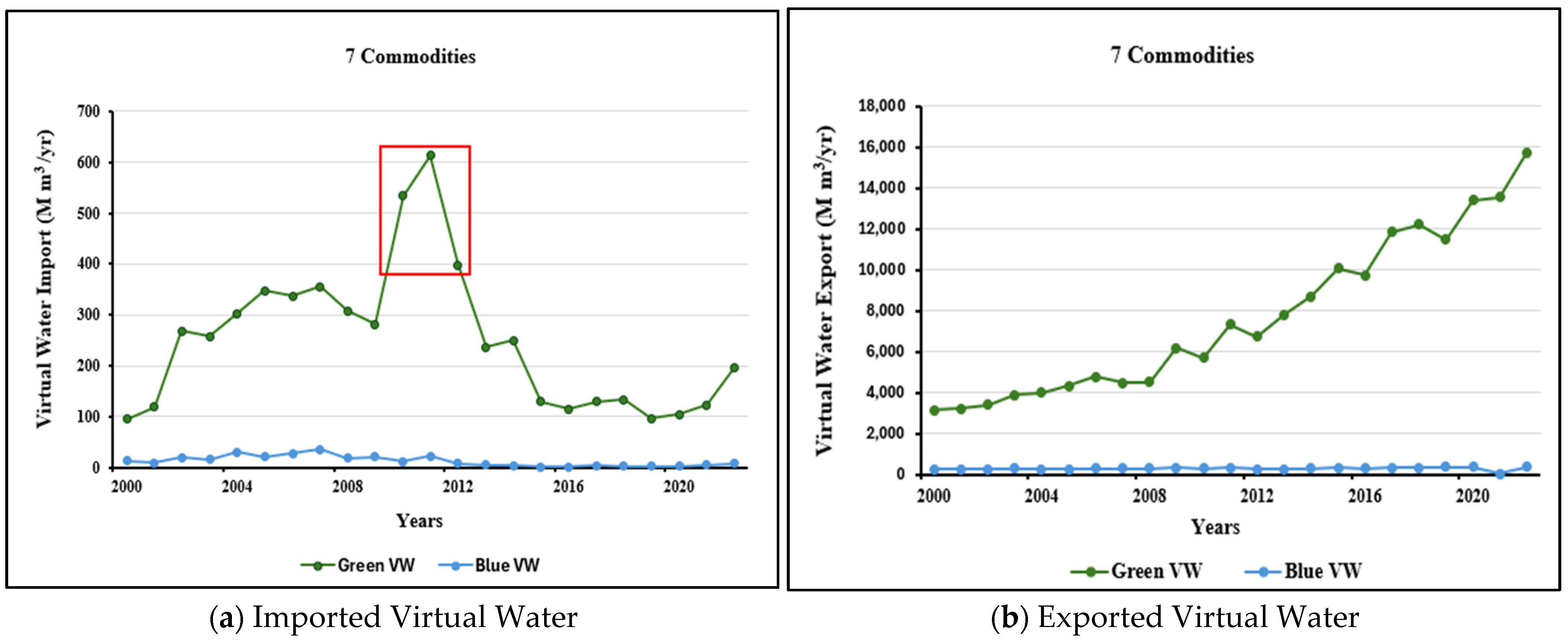 Appendix B.2. Ecuador’s Imported and Exported Virtual Water Amount