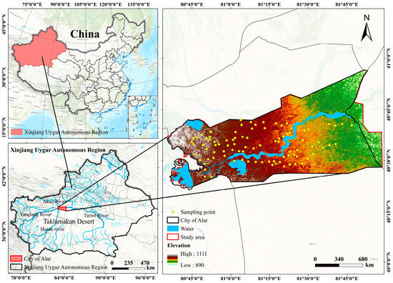 The Alar Reclamation Area (80°30′–81°58′ E, 40°22′–40°57′ N) is located in southern Xinjiang, China, on the southern flank of the Tianshan Mountains and along the northern margin of the Taklimakan Desert [26]. The region is situated on the fine alluvial plain of the Tarim River, the longest inland river in China. This geographical setting, together with long-term agricultural development, has shaped the area into a typical desert–oasis ecotone and one of China’s major regions of large-scale oasis agriculture [5]. The reclamation area has a total population of approximately 521,000 and covers an area of 4197.58 km2.