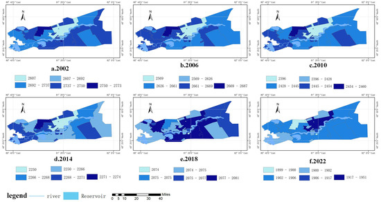 Spatial distribution of PET in the study area: (a) Spatial Distribution of PET in 2002; (b) Spatial Distribution of PET in 2006; (c) Spatial Distribution of PET in 2010; (d) Spatial Distribution of PET in 2014; (e) Spatial Distribution of PET in 2018; (f) Spatial Distribution of PET in 2022.