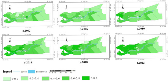 Spatial distribution of NDVI in the study area: (a) Spatial Distribution of NDVI in 2002; (b) Spatial Distribution of NDVI in 2006; (c) Spatial Distribution of NDVI in 2010; (d) Spatial Distribution of NDVI in 2014; (e) Spatial Distribution of NDVI in 2018; (f) Spatial Distribution of NDVI in 2022.