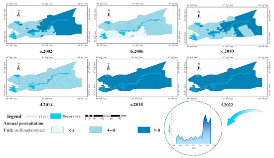 Spatial distribution of precipitation in the study area: (a) Spatial Distribution of precipitation in 2002; (b) Spatial Distribution of precipitation in 2006; (c) Spatial Distribution of precipitation in 2010; (d) Spatial Distribution of precipitation in 2014; (e) Spatial Distribution of precipitation in 2018; (f) Spatial Distribution of precipitation in 2022.