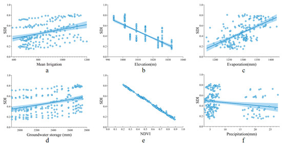 Linear correlation analyses were conducted sequentially between SDI and PET, precipitation, GWS, irrigation quota per unit area, NDVI, and elevation (Figure 10). The results showed that the factors influenced by human activities, NDVI, irrigation quota per unit area, and GWS, exhibited more pronounced linear relationships with SDI. In contrast, the climatic factors, including precipitation and PET, demonstrated weak linear relationships with SDI.