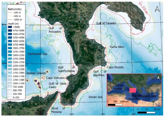From a climatic point of view, due to its geomorphological peculiarities, Calabria is characterized by a notable climatic variability with a mountain climate in the inland areas and a typically dry-summer subtropical climate, also known as the Mediterranean climate, along the coasts. Rainfall is frequent in winter, with snowfall at the highest elevations, but is less frequent during the summer, except for some occasional thunderstorms. The average annual rainfall is about 1100 mm, ranging between 1400 and 1800 mm in mountainous areas, with a maximum of about 2000 mm in the Serre, between 700 and 1000 mm on the Tyrrhenian coast, and about 500 mm on the Ionian coast, as shown in Figure 2, Right [51,52]. About the wave climate, both coasts are characterized by fetch lengths in the order of hundreds of kilometers up to a thousand, and the Ionian coasts are mainly exposed to the winds from Scirocco (southeast), and Grecale (northeast), while the Tyrrhenian coasts are mainly exposed to the winds of the Mistral (northwest). These different climatic conditions and exposure to winds cause considerable variability in terms of sea events affecting the various coastal areas. Indeed, in the Tyrrhenian Sea, the stormy wave conditions are concentrated along a few directions, coming mainly from the Mistral (northwest). Instead, in the Ionian Sea, the intense wave conditions can come from different directions, varying between northeast and southeast. From the seasonal point of view, in autumn on most of the Calabrian coasts, the maximum significant wave height values of sea storms are higher than in winter [53,54]. In addition, Calabria is a microtidal environment, so tidal excursion is negligible [55].