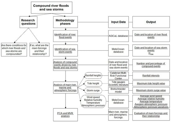 The methodology described below is a data-driven type and aims to provide answers to two research questions. The first concerns the assessment of existing conditions that lead to river floods and sea storms contemporarily. The second one concerns an evaluation of the main forcings, and their relationship, using Principal Component Analysis (PCA) and Multivariate Regression (MVR).