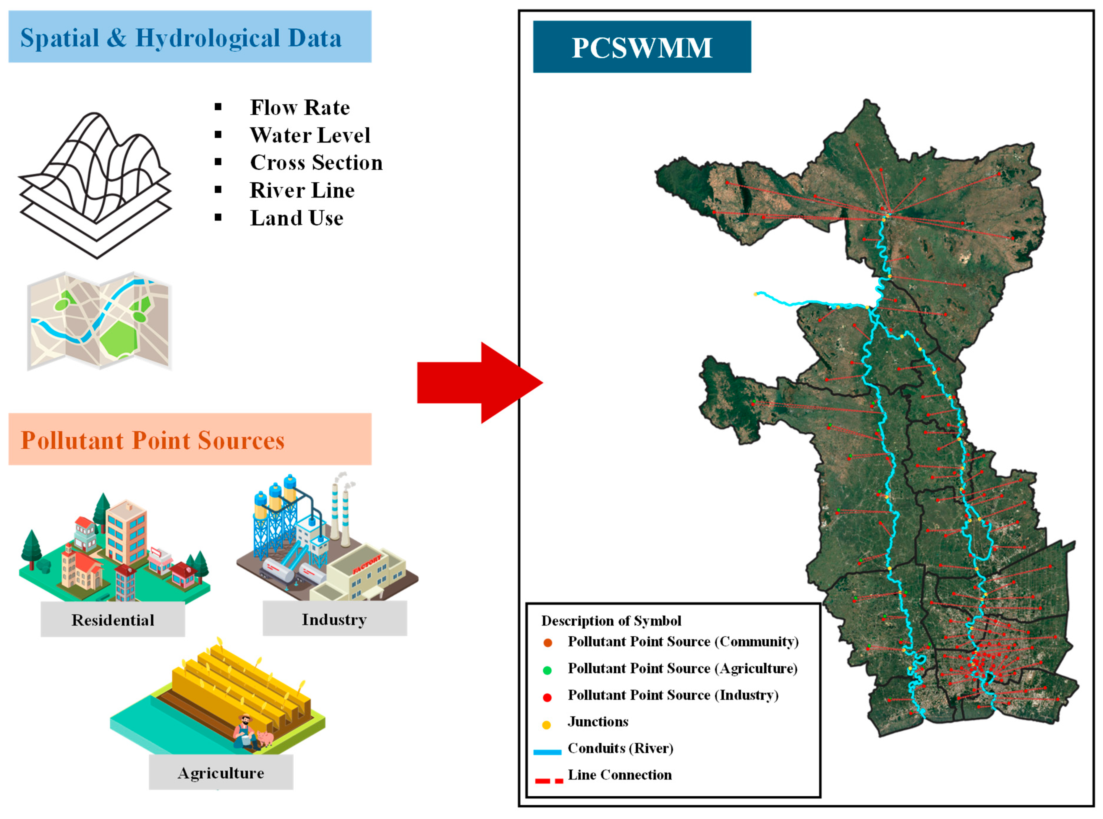 - Industrial loads were derived from the Department of Industrial Works (DIW) factory registry, using reported discharge points, industry types, and wastewater characteristics. Sector-specific pollutant coefficients were applied to estimate loads, with adjustments based on compliance records where available. All discharge locations were spatially aligned with the river and canal network for model routing [58].