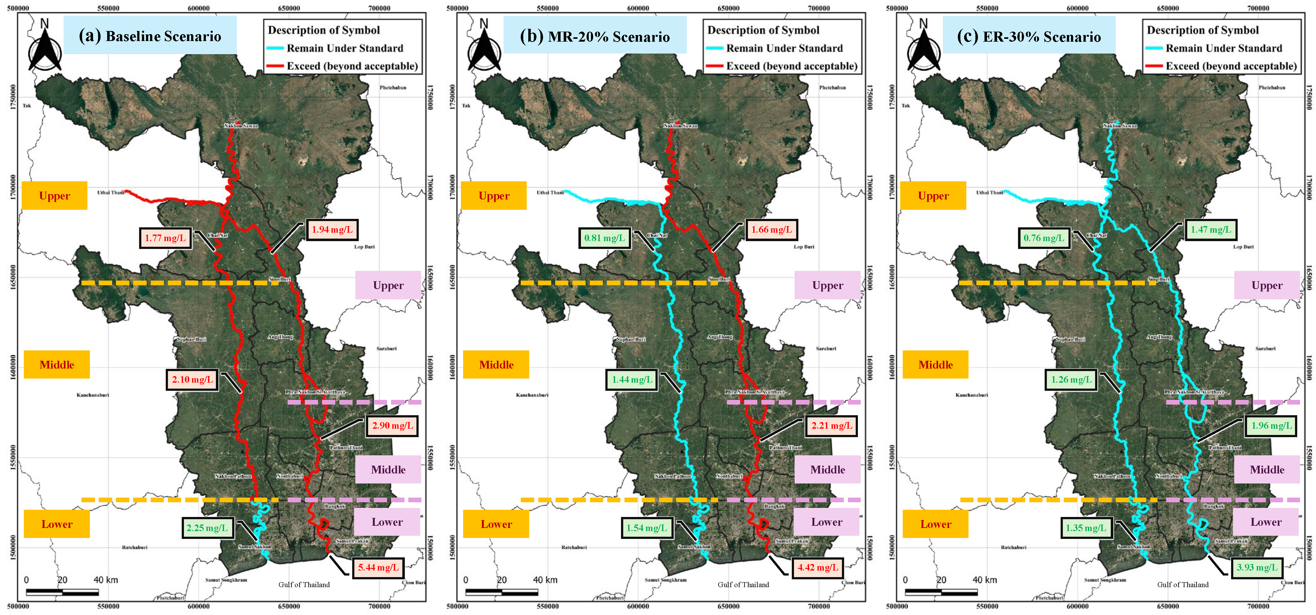 - Enhanced Reduction (ER-30%): Represents comprehensive mitigation efforts, aligned with national water quality goals, involving full-scale infrastructure deployment and strict enforcement mechanisms.