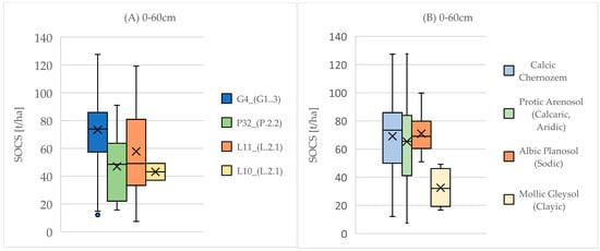 The order of SOCS average values from highest to lowest based on RSG is as follows: Albic Planosol (Sodic) > Calcic Chernozem > Protic Arenosol (Calcaric, Aridic) > Mollic Gleysol (Clayic) (Figure 3B). Calcic Chernozem showed a wide range of SOCS values from approximately 12 to 128 t·ha−1, with the mean and median near 75 t·ha−1. The interquartile range reflected moderate variability in SOC content. Protic Arenosol (Calcaric, Aridic): SOCS values ranged broadly from about 7 to 128 t·ha−1, with mean and median values roughly around 75 t·ha−1. This RSG demonstrated considerable variation in SOCS. Albic Planosol (Sodic) SOCS values ranged from approximately 51 to 100 t·ha−1, with an average near 70 t·ha−1. Mollic Gleysol (Clayic) showed lower SOCS values ranging from approximately 16 to 49 t·ha−1, indicating relatively lower SOCS compared to the other RSGs.