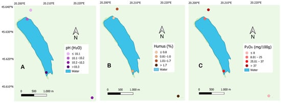 Slano Kopovo: (A) the distribution of pH (H2O); (B) the distribution of humus (%); (C) the distribution of P2O5 mg·100 g−1.