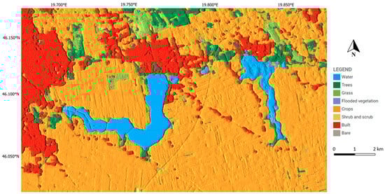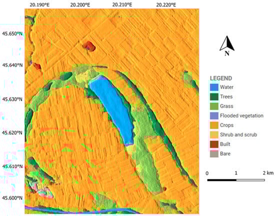 LULC map shows that the Palić and Ludaš Lake surroundings area is predominantly agricultural (Figure 6). Agricultural-dominated areas predominantly occupy the western, southern, and eastern peripheries of both lakes, whereas the northern region has signs of anthropogenic development (built). In addition, the western part of the Palić Lake locality is hugely dominated by built (anthropogenic) areas. Other LULC categories, such as trees and grass, are mostly scattered in various parts of these lakes’ surroundings. Flooded vegetation is more characteristic for the Ludaš Lake locality. In the Palić Lake locality, flooded vegetation occurs only in the minor western shoreline part, while in Ludaš Lake it occurs in various zones and is heavily present in the northeastern part of this lake. Shrub and scrub categories are present in some scattered minor parts. Bare land has not been detected.
