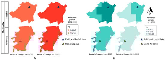 (A) Observed daily average temperature changes for the two periods, 2001–2020 and 2011–2020, with a reference period of 1971–2000; (B) observed precipitation changes for the two periods, 2001–2020 and 2011–2020, with a reference period of 1971–2000; based on data from the Digital Climate and Climate Change Atlas of the Republic of Serbia [49].